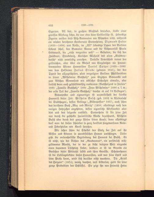 Bedeutender und eigenartiger ist unzweifelhaft der stärksteHumorist dieser Zeit: Wilhelm Busch (geb. 1832 in Wiedensahl bei Stadthagen ), dessen Anfänge („Bilderpossen" 1857), auch schoudas berühmte Buch „Max und Moritz " (1858) allerdings noch demvorigen Jahrzehnt angehören, dessen eigentliche Wirksamkeit aberdies und das folgende ausfüllt. Stettenheim ist für seine Zeitnur durch die geschickte specialistische Mache bezeichnend, WilhelmBusch aber durch das ganze Wesen seiner Kunst; denn allerdingsdarf man bei diesen scheinbar so ganz kunstlos hingeworfenen Reim-und Federspielen von Kunst sprechen.