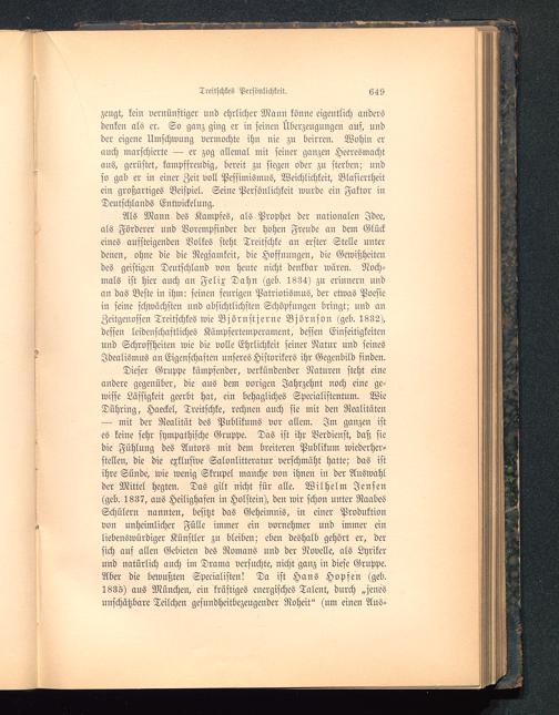 Als Mann des Kampfes, als Prophet der nationalen Idee,als Förderer und Vorempfinder der hohen Freude an dem Glückeines aussteigenden Volkes steht Treitschke an erster Stelle unterdenen, ohne die die Regsamkeit, die Hoffnungen, die Gewißheitendes geistigen Deutschland von heute nicht denkbar wären. Noch-mals ist hier auch an Felix Bahn (geb. 1834) zu erinnern undan das Beste in ihm: seinen feurigen Patriotismus, der etwas Poesiein seine schwächsten und absichtlichsten Schöpfungen bringt; und anZeitgenossen Treitschkes wie Björnstjerne Björnson (geb. 1832),dessen leidenschaftliches Kämpfertemperament, dessen Einseitigkeitenund Schroffheiten wie die volle Ehrlichkeit seiner Natur und seinesIdealismus an Eigenschaften unseres Historikers ihr Gegenbild finden.