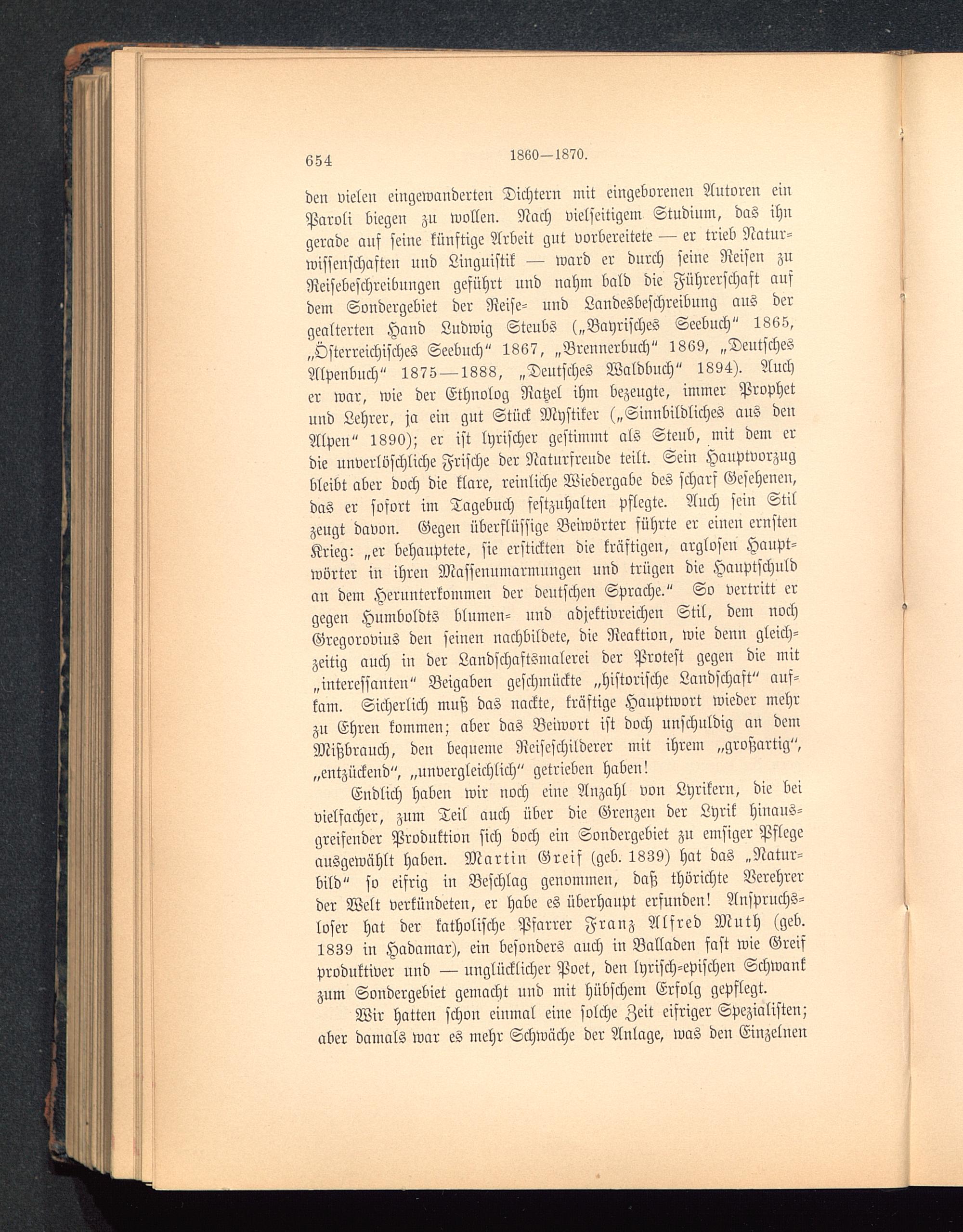 den vielen eingewanderten Dichtern mit eingeborenen Autoren einParoli biegen zn wollen. Nach vielseitigem Studium, das ihngerade auf seine künftige Arbeit gut vorbereitete — er trieb Natur-wissenschaften und Linguistik — ward er durch seine Reisen zuReisebcschreibnngen geführt uud nahm bald die Führerschaft aufdem Sondergebiet der Reise- und Landesbeschreibuug aus dergealterten Hand Lndwig Steubs („Bayrisches Seebuch" 1865,„Österreichisches Seebuch" 1867, „Brennerbuch" 1869, „DeutschesAlvenbnch" 1875 — 1888, „Deutsches Waldbuch" 1894). Aucher war, wie der Ethnolog Ratzel ihm bezeugte, immer Prophetund Lehrer, ja ein gut Stück Mystiker („Sinnbildliches aus denAlpen " 1890); er ist lyrischer gestimmt als Steub, mit dem erdie unverlöschliche Frische der Naturfreude teilt. Sein Hauptvorzugbleibt aber doch die klare, reinliche Wiedergabe des scharf Gesehenen,das er sofort im Tagebuch festzuhalten pflegte. Auch sein Stilzeugt davon. Gegeu überflüssige Beiwörter führte er einen ernstenKrieg: „er behauptete, sie erstickten die kräftigen, arglosen Haupt-wörter in ihren Massenumarmungen und trügen die Hauptschuldan dem Herunterkommen der deutschen Sprache." So vertritt ergegeu Humboldts blumen- nnd adjektivreichen Stil, dem nochGregorovins deu seinen nachbildete, die Reaktion, wie denn gleich-zeitig auch in der Landschaftsmalerei der Protest gegen die mit„interessanten" Beigaben geschmückte „historische Landschaft" auf-kam. Sicherlich muß das nackte, kräftige Hauptwort wieder mehrzu Ehren kommen; aber das Beiwort ist doch unschuldig an demMißbrauch, den beaneme Reiseschilderer mit ihrem „großartig",„entzückend", „unvergleichlich" getrieben haben!