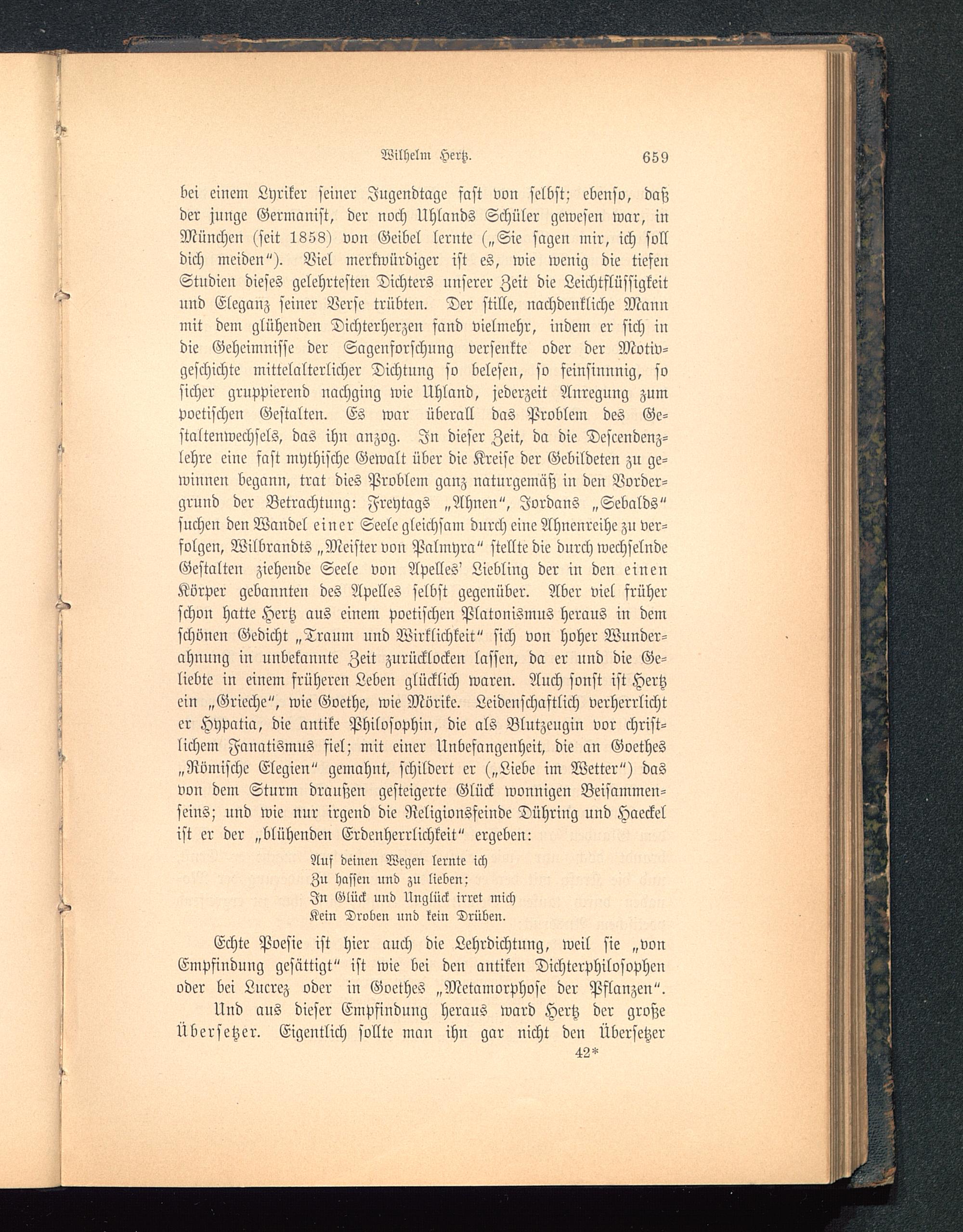 bei einem Lyriker seiner Jugendtage fast von selbst; ebenso, daßder junge Germanist, der noch Uhlands Schüler gewesen war, inMünchen (seit 1853) von Geibel lernte („Sie sagen mir, ich solldich meiden"). Viel merkwürdiger ist es, wie wenig die tiefenStudien dieses gelehrtesten Dichters unserer Zeit die Leichtflüssigkeitund Eleganz seiner Verse trübten. Der stille, nachdenkliche Mannmit den: glühenden Dichterherzen fand vielmehr, indem er sich indie Geheimnisse der Sagensorschnng versenkte oder der Motiv-geschichte mittelalterlicher Dichtung so belesen, so feinsinnnig, sosicher gruppierend nachging wie Uhland, jederzeit Anregung zumpoetischen Gestalten. Es war überall das Problem des Ge-staltenwechsels, das ihn anzog. In dieser Zeit, da die Descendenz-lehre eine fast mythische Gewalt über die Kreise der Gebildeten zu ge-winnen begann, trat dies Problem ganz naturgemäß in den Vorder-grund der Betrachtung: Freytags „Ahnen", Jordans „Sebalds"suchen den Wandel einer Seele gleichsam durch eine Ahnenreihe zu ver-folgen, Wilbrandts „Meister von Palmyra" stellte die durch wechselndeGestalten ziehende Seele von Apelles ' Liebling der in den einenKörper gebannten des Apelles selbst gegenüber. Aber viel früherfchon hatte Hertz aus einem poetischen Platonismus heraus in demschönen Gedicht „Traum und Wirklichkeit" sich von hoher Wunder-ahuung in unbekannte Zeit zurücklocken lassen, da er und die Ge-liebte in einem früheren Leben glücklich waren. Auch fönst ist Hertzein „Grieche", wie Goethe, wie Mörike . Leidenschaftlich verherrlichter Hypatia , die antike Philosophin, die als Blutzeugin vor christ-lichem Fanatismus fiel; mit einer Unbefangenheit, die an Goethes„Römische Elegien " gemahnt, schildert er („Liebe im Wetter") dasvon dem Sturm draußen gesteigerte Glück wonnigen Beisammen-seins; und wie nur irgend die Religionsfeinde Dühring und Haeckelist er der „blühenden Erdenherrlichkeit" ergeben: