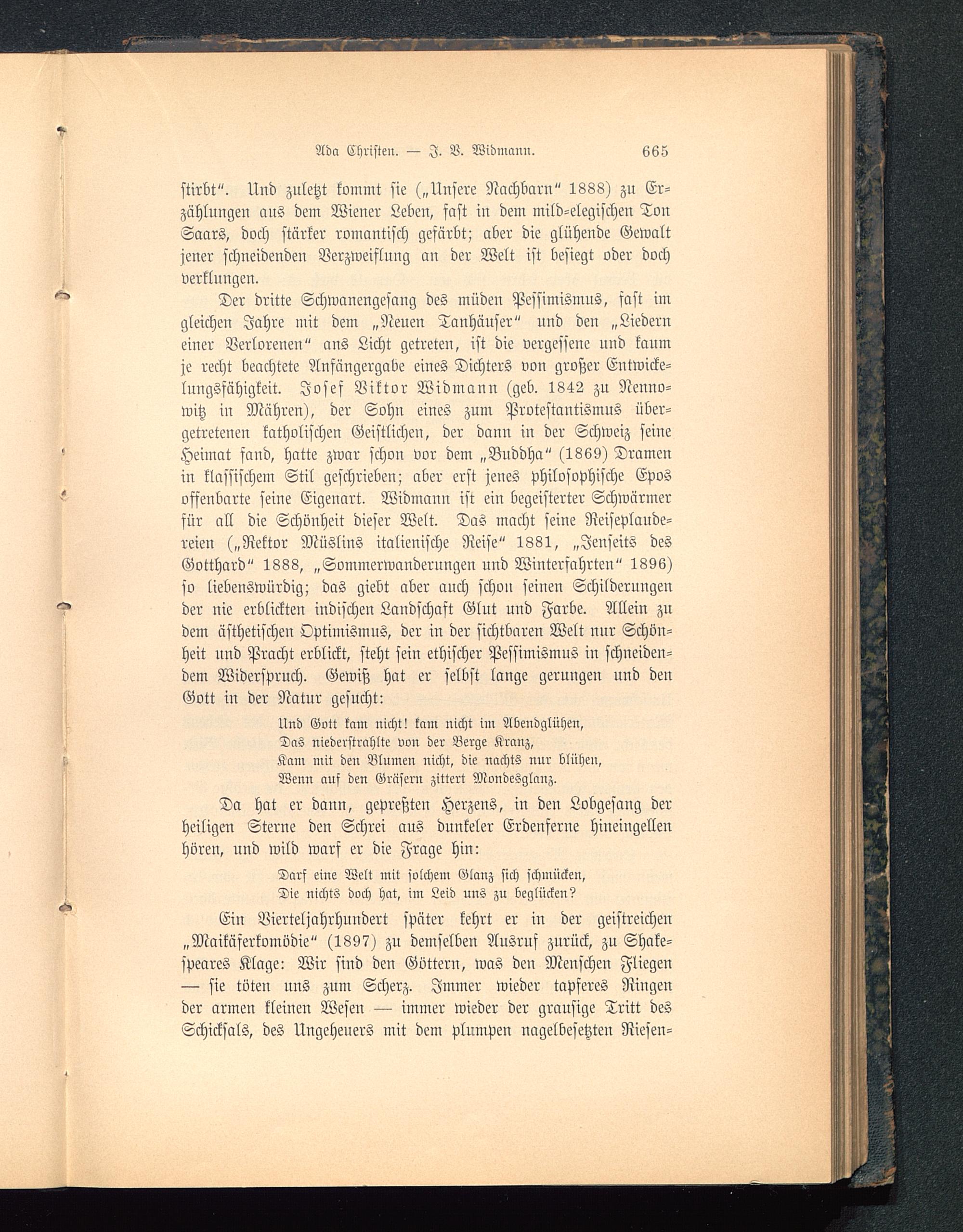 Der dritte Schwanengesang des müden Pessimismus, fast imgleichen Jahre mit dem „Neuen Tanhäuser" und den „Liederneiner Verlorenen" ans Licht getreten, ist die vergessene und kaumje recht beachtete Anfängergabe eines Dichters von großer Eutwicke-lungsfähigkeit. Josef Viktor Widmann (geb. 1842 zu Nenno-witz in Mähren ), der Sohn eines zum Protestantismus über-getretenen katholischen Geistlichen, der dann in der Schweiz seineHeimat fand, hatte zwar schon vor dem „Buddha" (1869) Dramenin klassischem Stil geschrieben; aber erst jenes philosophische Eposoffenbarte seine Eigenart. Widmann ist ein begeisterter Schwärmerfür all die Schönheit dieser Welt. Das macht seine Reiseplaude-reien („Rektor Müslins italienische Reise" 1381, „Jenseits desGotthard" 1888, „Sommerwanderungen und Winterfahrten" 1896)so liebenswürdig; das giebt aber auch schon seinen Schilderungender nie erblickten indischen Landschaft Glut uud Farbe. Allein zudem ästhetischen Optimismus, der in der sichtbaren Welt nur Schön-heit und Pracht erblickt, steht sein ethischer Pessimismus in schneiden-dem Widerspruch. Gewiß hat er selbst lange gerungen und denGott in der Natur gesucht: