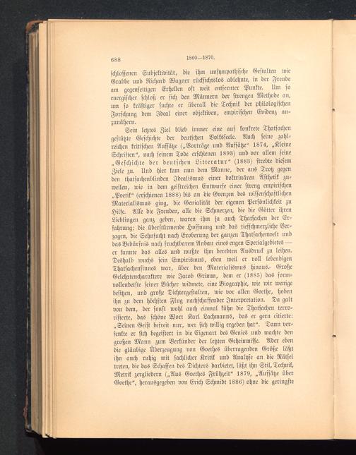 Sein letztes Ziel blieb immer eine auf konkrete Thatsachengestützte Geschichte der deutschen Volksseele. Auch seine zahl-reichen kritischen Aufsätze („Vorträge und Aufsätze" 1874, „KleineSchriften", nach seinem Tode erschienen 1893) und vor allem seine„Geschichte der deutschen Litteratur" (1883) strebte diesemZiele zu. Und hier kam nun dem Manne, der aus Trotz gegenden thatsachenblinden Idealismus einer doktrinären Ästhetik zu-weilen, wie in dem geistreichen EntWurfe einer streng empirischen„Poetik" (erschienen 1888) bis an die Grenzen des wissenschaftlichenMaterialismus ging, die Genialität der eigenen Persönlichkeit zuHilfe. Alle die Frenden, alle die Schmerzen, die die Götter ihrenLieblingen ganz geben, waren ihm ja auch Thatsachen der Er-fahrung; die überstürmende Hoffnung und das tiefschmerzliche Ver-zagen, die Sehnslicht nach Eroberung der ganzen Thatsachenwelt unddas Bedürfnis nach fruchtbarem Anbau eines engen Specialgebietes —er kannte das alles und wußte ihm beredten Ausdruck zu leihen.Deshalb wuchs sein Empirismus, eben weil er voll lebendigenThatsachensinnes war, über deu Materialismus hinans. GroßeGelehrtencharaktere wie Jacob Grimm , dem er (1885) das form-vollendetste seiner Bücher widmete, eine Biographie, wie wir wenigebesitzen, nnd große Dichtergestalten, wie vor allen Goethe, hobenihn zu dem höchsten Flug nachschaffender Interpretation. Da galtvon dem, der sonst Wohl anch einmal kühn die Thatsachen terro-risierte, das schöne Wort Karl Lachmanns , das er gern citierte:„Seinen Geist befreit nur, wer sich willig ergeben hat". Dann ver-senkte er sich begeistert in die Eigenart des Genies und machte dengroßen Mann zum Verkünder der letzten Geheimnisse. Aber ebendie gläubige Überzeugung von Goethes überragenden Größe läßtihn anch ruhig mit sachlicher Kritik und Analyse an die Rätseltreten, die das Schaffen des Dichters darbietet, läßt ihn Stil, Technik,Metrik zergliedern („Aus Goethes Frühzeit" 1879, „Aufsätze überGoethe", herausgegeben von Erich Schmidt 1886) ohne die geringste