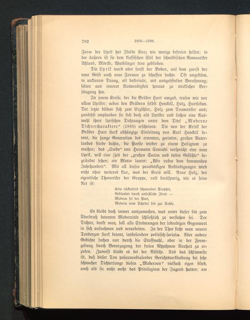 In jenem Kreise, der die Brüder Hart umgab, trafen wir vorallem Lyriker: neben den Brüdern selbst Henckell, Holz, Hartleben.Der letzte bildete sich zum Erzähler, Holz zum Dramatiker aus;zunächst empfanden sie sich doch als Lyriker und ließen eine Aus-wahl ihrer lyrischen Dichtungen unter dem Titel „ModerneDichtercharaktere" (1885) erscheinen. Die von der Kritik derBrüder Hart stark abhängige Einleitung von Karl Henckell be-tont, die juuge Generation des erneuten, geeinten, großen Vater-landes strebe dahin, die Poesie wieder zu einem Heiligtum zumacheu; das „Credo" von Hermann Conradi verspricht eine neueLyrik, will eine Zeit der „großen Seelen und tiefen Gefühle" be-gründet sehen; ein Motto lautet: „Wir rufeu dem kommendenJahrhundert". Mit all diesen pausbäckigen Ankündigungen wirdnicht ohne weiteres klar, was der Kreis will. Nrno Holz, dereigentliche Theoretiker der Gruppe, ruft breitspurig, wie es seiueArt ist: