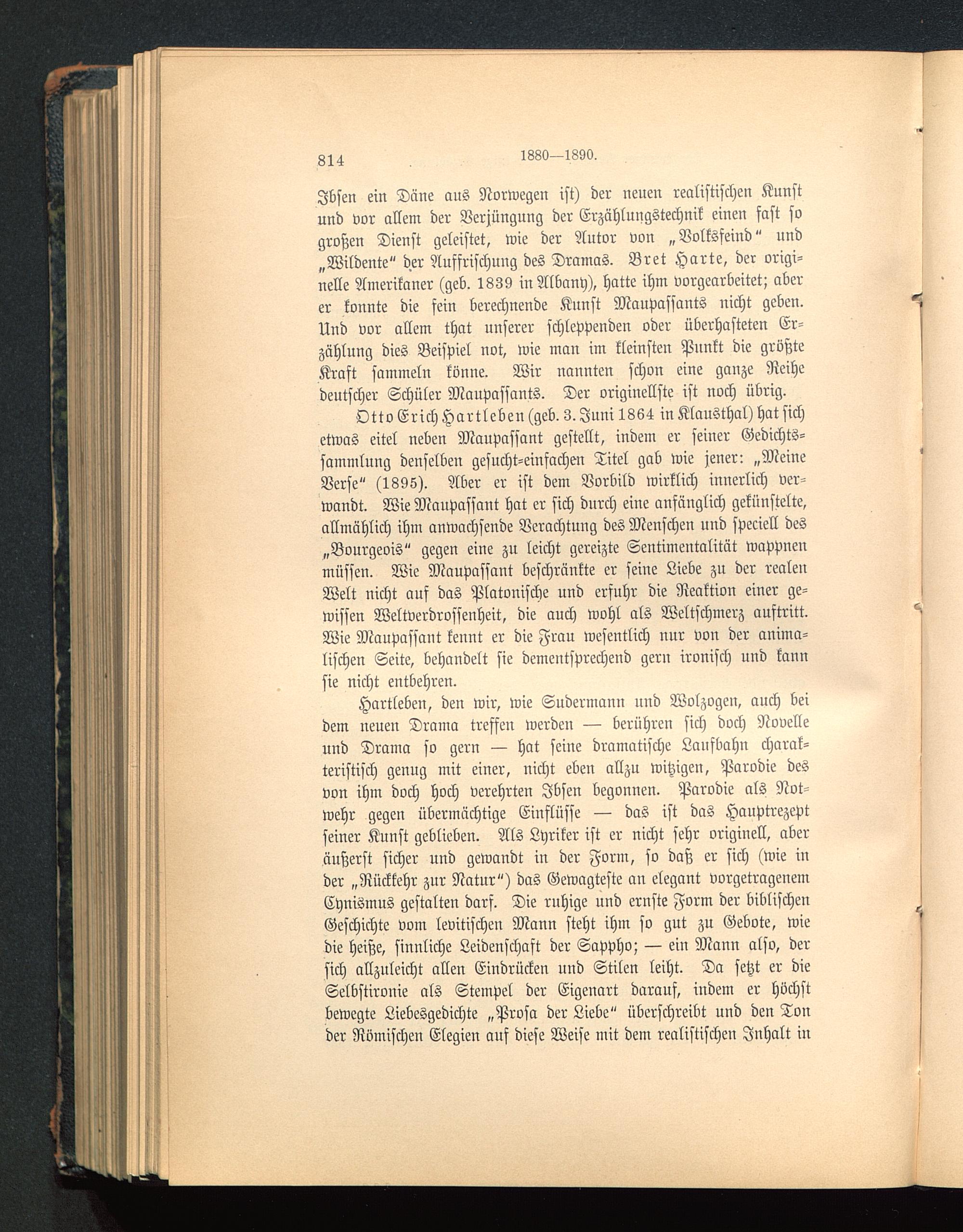 Otto Erich Hartleben (geb. 3. Juni 1864 in Klausthal) hat sichetwas eitel neben Maupassant gestellt, indem er seiner Gedichts-sammlung denselben gesucht-einfachen Titel gab wie jener: „MeineVerse" (1895). Aber er ist dem Vorbild wirklich innerlich ver-wandt. Wie Maupassant hat er sich durch eine anfänglich gekünstelte,allmählich ihm anwachsende Verachtung des Menschen und speciell des„Bourgeois" gegen eine zu leicht gereizte Sentimentalität wappnenmüssen. Wie Maupassant beschränkte er seine Liebe zu der realenWelt nicht auf das Platonische und erfuhr die Reaktion einer ge-wissen Weltverdrossenheit, die auch wohl als Weltschmerz auftritt.Wie Maupassant kennt er die Frau wesentlich nur von der anima-lischen Seite, behandelt sie dementsprechend gern ironisch und kannsie nicht entbehren.