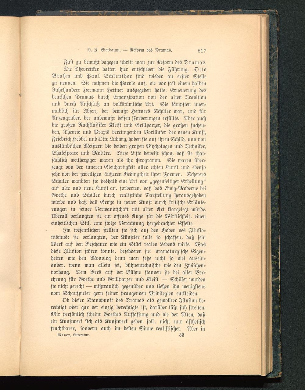 Im wesentlichen stellten sie sich auf den Boden des Illusio-nismus: sie verlangten, der Künstler solle so schaffen, daß seinWerk auf deu Beschauer wie ein Stück realen Lebens wirke. Wasdiese Illusion stören könnte, befehdeten sie: dramaturgische Eigen-heiten wie den Monolog denn man setze nicht so viel ausein-ander, wenn mau allein sei, bühnentechnische wie den Zwischen-vorhang. Dem Vers auf der Bühne standen sie bei aller Ver-ehrung für Goethe und Grillparzer und Kleist — Schiller wurdeusie nicht gerecht — mißtrauisch gegenüber und ließen ihn wenigstensvom Schauspieler gern seiner prangenden Privilegien entkleiden.