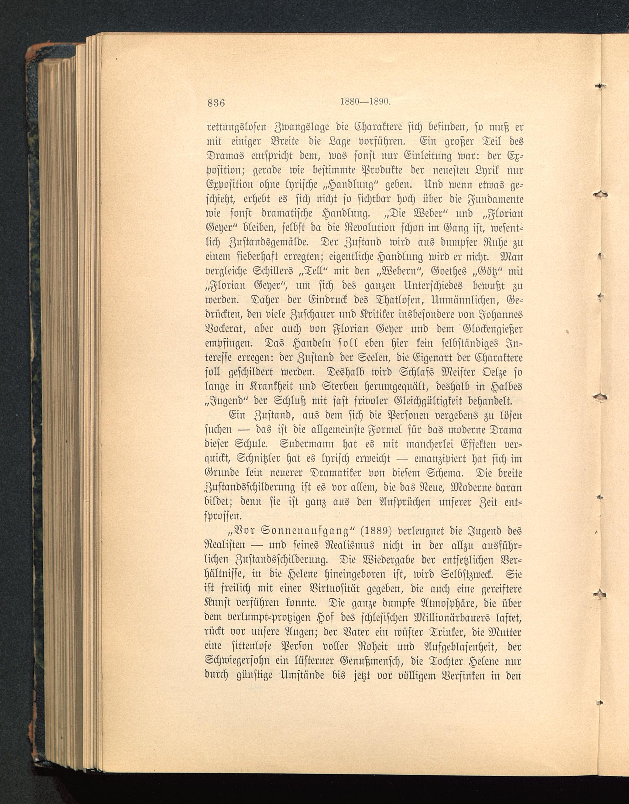 „Vor Sonnenaufgang" (1889) verleugnet die Jugend desRealisten — und seines Realismus nicht in der allzu ausführ-lichen Zustandsschilderung. Die Wiedergabe der entsetzlichen Ver-hältnisse, in die Helene hineingeboren ist, wird Selbstzweck. Sieist freilich mit einer Virtuosität gegeben, die auch eine gereiftereKunst verführen konnte. Die ganze dumpfe Atmosphäre, die überdem verlumpt-protzigen Hof des schlesischen Millionärbauers lastet,rückt vor unsere Angen; der Vater ein wüster Trinker, die Muttereine sittenlose Person voller Roheit und Aufgeblasenheit, derSchwiegersohn ein lüsterner Genußmensch, die Tochter Helene nurdurch günstige Umstände bis jetzt vor völligem Versinken in den