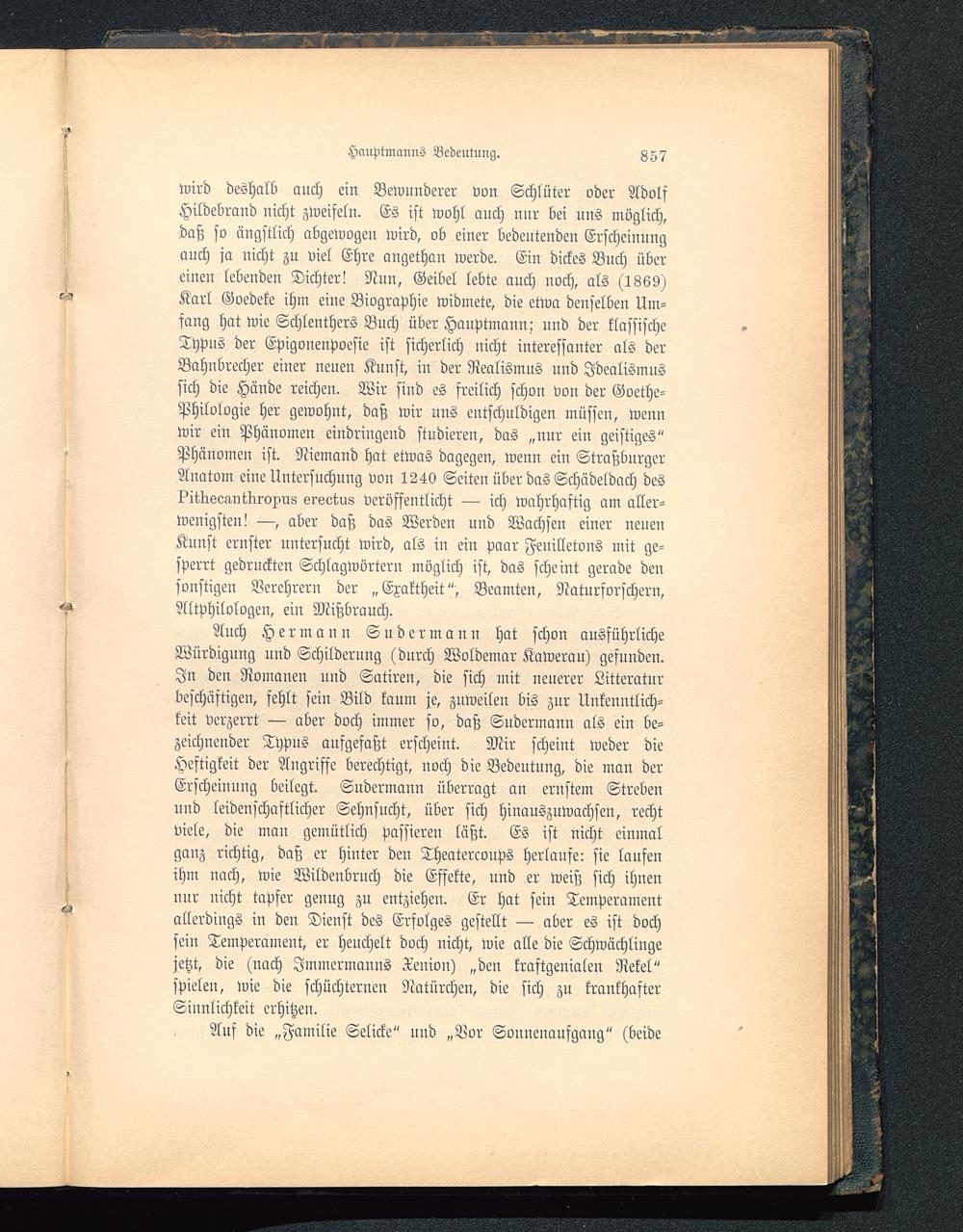 Wird deshalb auch ein Bewunderer von Schlüter oder AdolfHildebrand nicht zweifeln. Es ist wohl auch nnr bei uns möglich,daß so ängstlich abgewogen wird, ob einer bedeutenden Erscheinungauch ja nicht zu viel Ehre angethan werde. Ein dickes Buch übereinen lebenden Dichter! Nun, Geibel lebte auch uoch, als (1869)Karl Goedeke ihm eine Biographie widmete, die etwa denselben Um-fang hat wie Schlenthers Buch über Hauptmaun; und der klassischeTypus der Epigonenpoesie ist sicherlich nicht interessanter als derBahnbrecher einer neuen Kunst, in der Realismus uud Idealismussich die Hände reichen. Wir sind es freilich schon von der Goethe-Philologie her gewohnt, daß wir uus eutschuldigen müssen, wennwir ein Phänomen eindringend studieren, das „nur ein geistiges"Phänomen ist. Niemand hat etwas dagegen, wenn ein StraßburgerAuatom eine Untersuchung von 1240 Seiten über das Schädeldach des?it1röo-inttiroxu8 ersctus veröffentlicht — ich wahrhaftig am aller-wenigsten! —, aber daß das Werden und Wachsen einer neuenKunst ernster untersucht wird, als in ein paar Feuilletons mit ge-sperrt gedruckten Schlagwörtern möglich ist, das scheint gerade densonstigen Verehrern der „Exaktheit", Beamten, Naturforschern,Altphilologen, ein Mißbrauch.