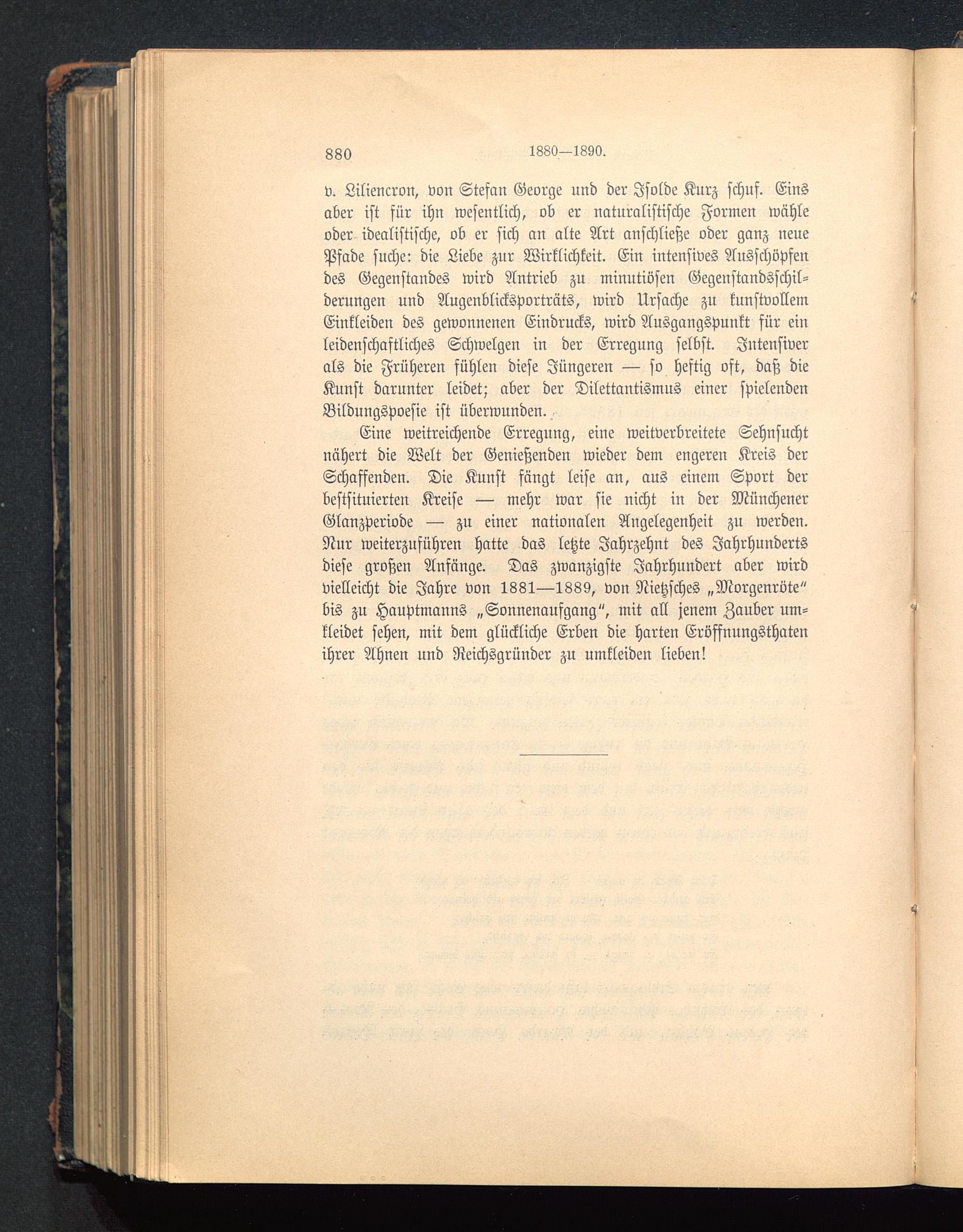 Eine weitreichende Erregung, eine weitverbreitete Sehnsuchtnähert die Welt der Genießenden wieder dem engeren Kreis derSchaffenden. Die Kunst fängt leise an, aus einem Sport derbestsituierten Kreise — mehr war sie nicht in der MünchenerGlanzperiode — zu einer nationalen Angelegenheit zu werden.Nur weiterzuführen hatte das letzte Jahrzehnt des Jahrhundertsdiese großen Anfänge. Das zwanzigste Jahrhundert aber wirdvielleicht die Jahre von 1881—1889, von Nietzsches „Morgenröte"bis zu Hauptmanns „Sonnenaufgang", mit all jenem Zauber um-kleidet sehen, mit dem glückliche Erben die harten Eröffnungsthatenihrer Ahnen und Reichsgründer zu umkleiden lieben!