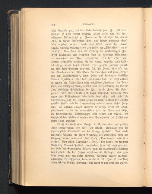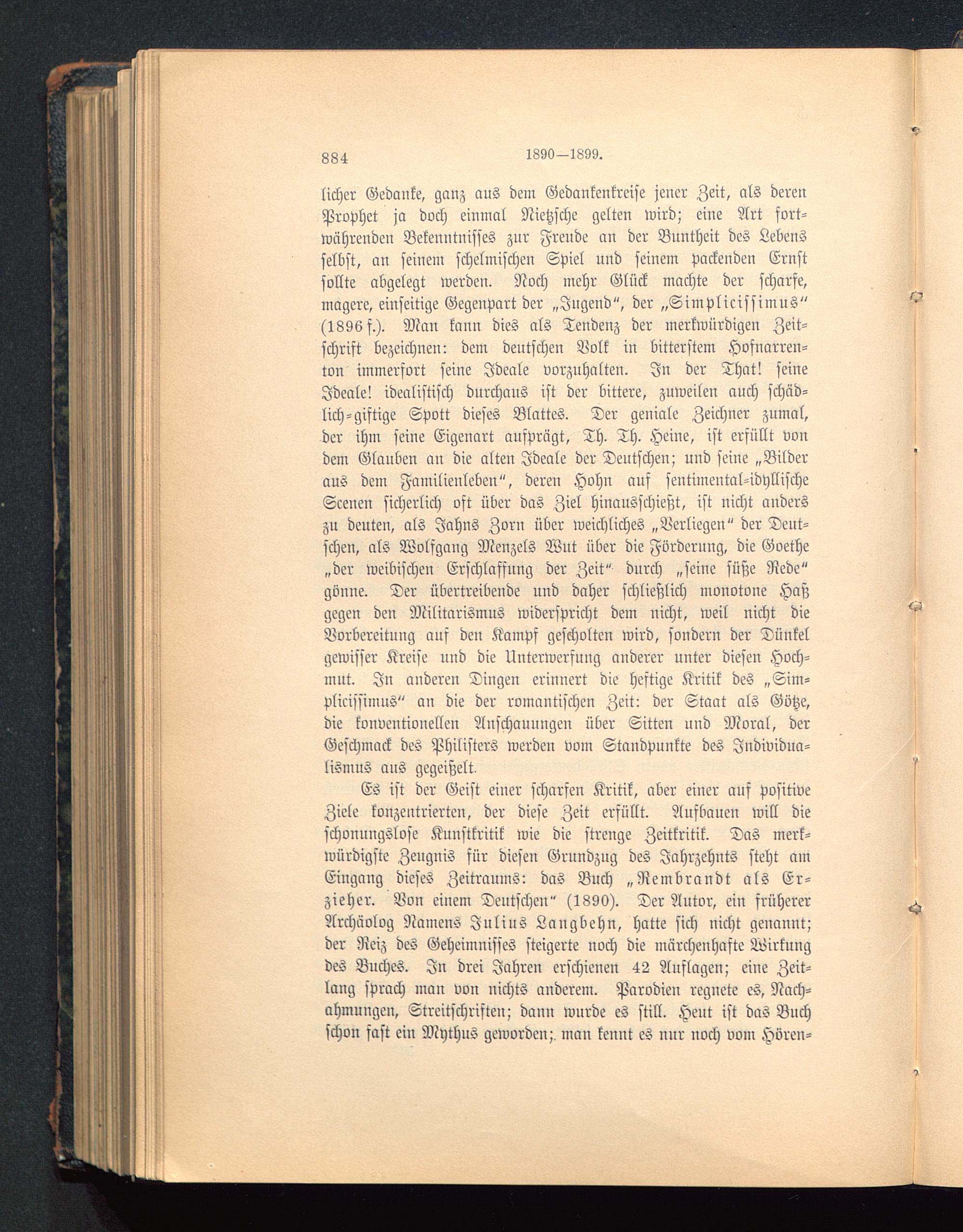 Es ist der Geist einer scharfen Kritik, aber einer auf positiveZiele konzentrierten, der diese Zeit erfüllt. Aufbaueu will dieschonungslose Kunstkritik wie die strenge Zeitkritik. Das merk-würdigste Zeugnis für diesen Grundzug des Jahrzehnts steht amEingang dieses Zeitraums: das Buch „Rembrandt als Er-zieher. Von einem Deutschcu" (1890). Der Autor, ein frühererArchäolog Namens Julius Langbehn , hatte sich nicht genannt;der Reiz des Geheimnisses steigerte noch die märchenhafte Wirkungdes Buches. In drei Jahren erschienen 42 Auflagen; eine Zeit-lang sprach man von nichts anderem. Parodien regnete es, Nach-ahmungen, Streitschriften; dann wurde es still. Heut ist das Buchschon fast ein Mythus geworden;, man kennt es nur noch vom Hören-
