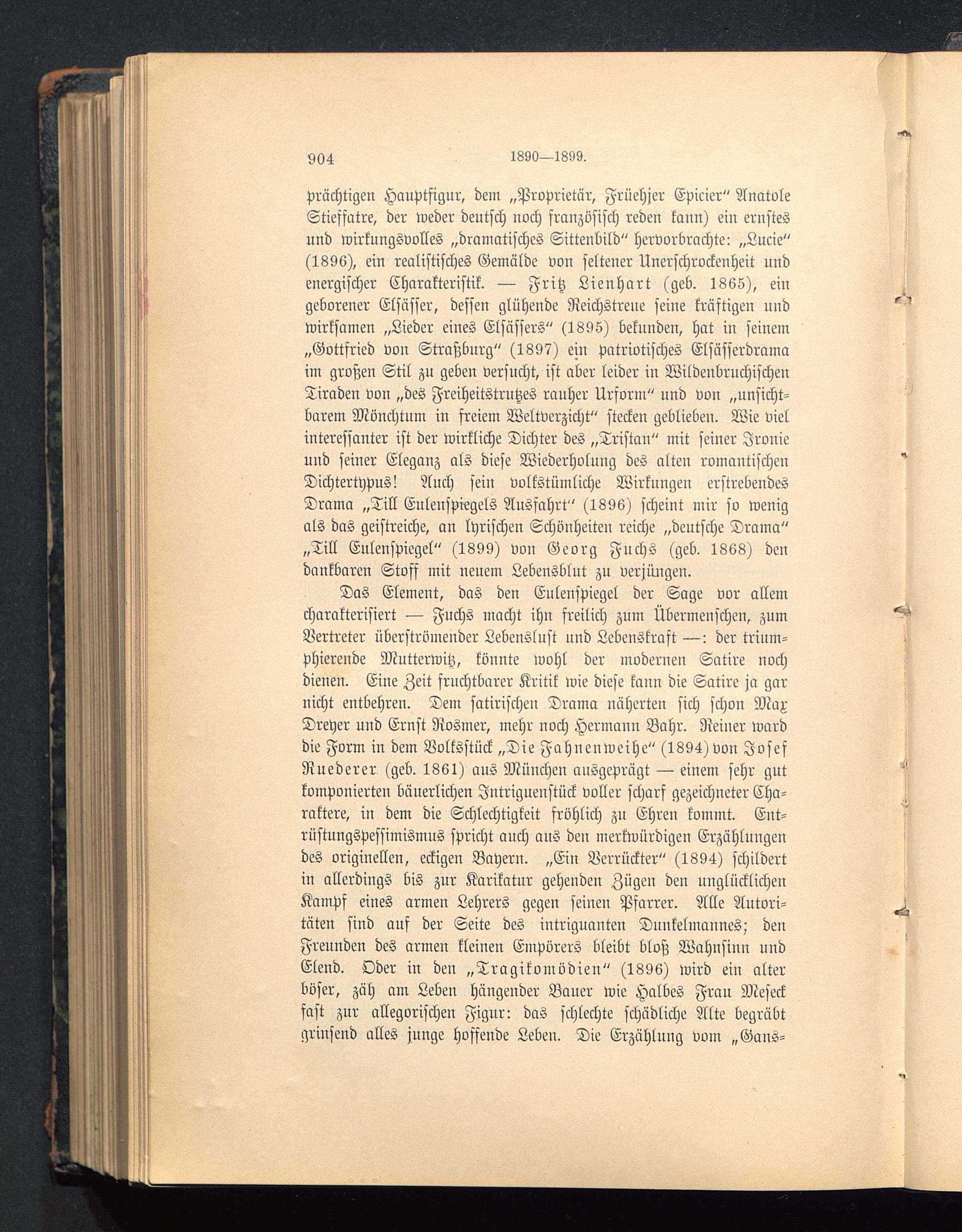prächtigen Hauptfigur, dem „Proprietär, Früehjer Epicier" AnatoleStieffatre, der weder deutsch noch französisch reden kann) ein ernstesund wirkungsvolles „dramatisches Sittenbild" hervorbrachte: „Lucie"(1896), ein realistisches Gemälde von seltener Unerschrockenheit undenergischer Charakteristik. — Fritz Lienhart (geb. 1865), eingeborener Elsässer, dessen glühende Reichstrene seine kräftigen undwirksamen „Lieder eines Elsüssers" (1895) bekunden, hat in seinem„Gottfried von Straßburg " (1897) ein Patriotisches Elsüsscrdramaim großen Stil zu geben versucht, ist aber leider in WildenbrnchischenTiraden von „des Freiheitstrutzes rauher Urform" und von „unsicht-barem Mönchtum in freiem Weltverzicht" stecken geblieben. Wie vielinteressanter ist der wirkliche Dichter des „Tristan " mit seiner Ironieund seiner Eleganz als diese Wiederholung des alten romantischenDichtertypus! Auch seiu volkstümliche Wirkungen erstrebendesDrama „Till Euleuspiegels Ausfahrt" (1896) scheint mir so wenigals das geistreiche, an lyrischen Schönheiten reiche „deutsche Drama"„Till Eulenspiegel" (1899) von Georg Fuchs (geb. 1868) deudankbaren Stoff mit neuem Lebensblut zu verjüngen.