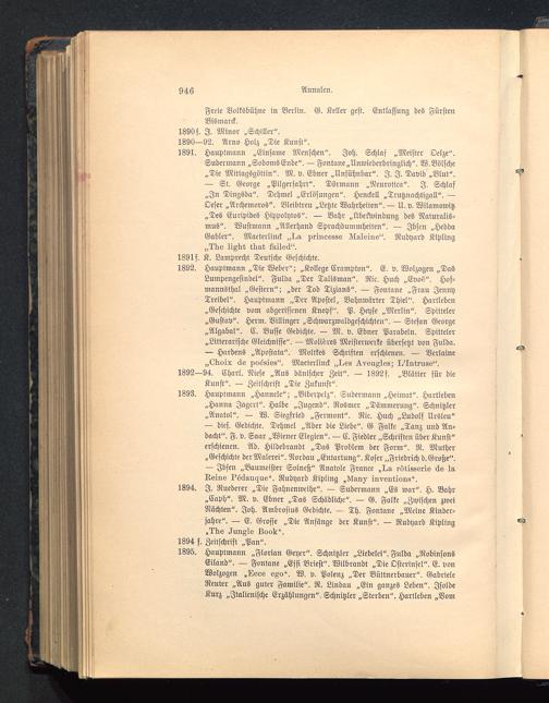 1894. I. Ruederer „Die Fahnenweihe". — Sudermann „Es war". H. Bahr „Caph". M. v. Ebner „Das Schädliche". — G. Falke „Zwischen zweiNächten". Joh. Ambrosius Gedichte. — Th. Fontane „Meine Kinder-jahre". — E. Grosse „Die Anfänge der Kunst". — Rudyard Kipliug,rke ^UQZIs Look".