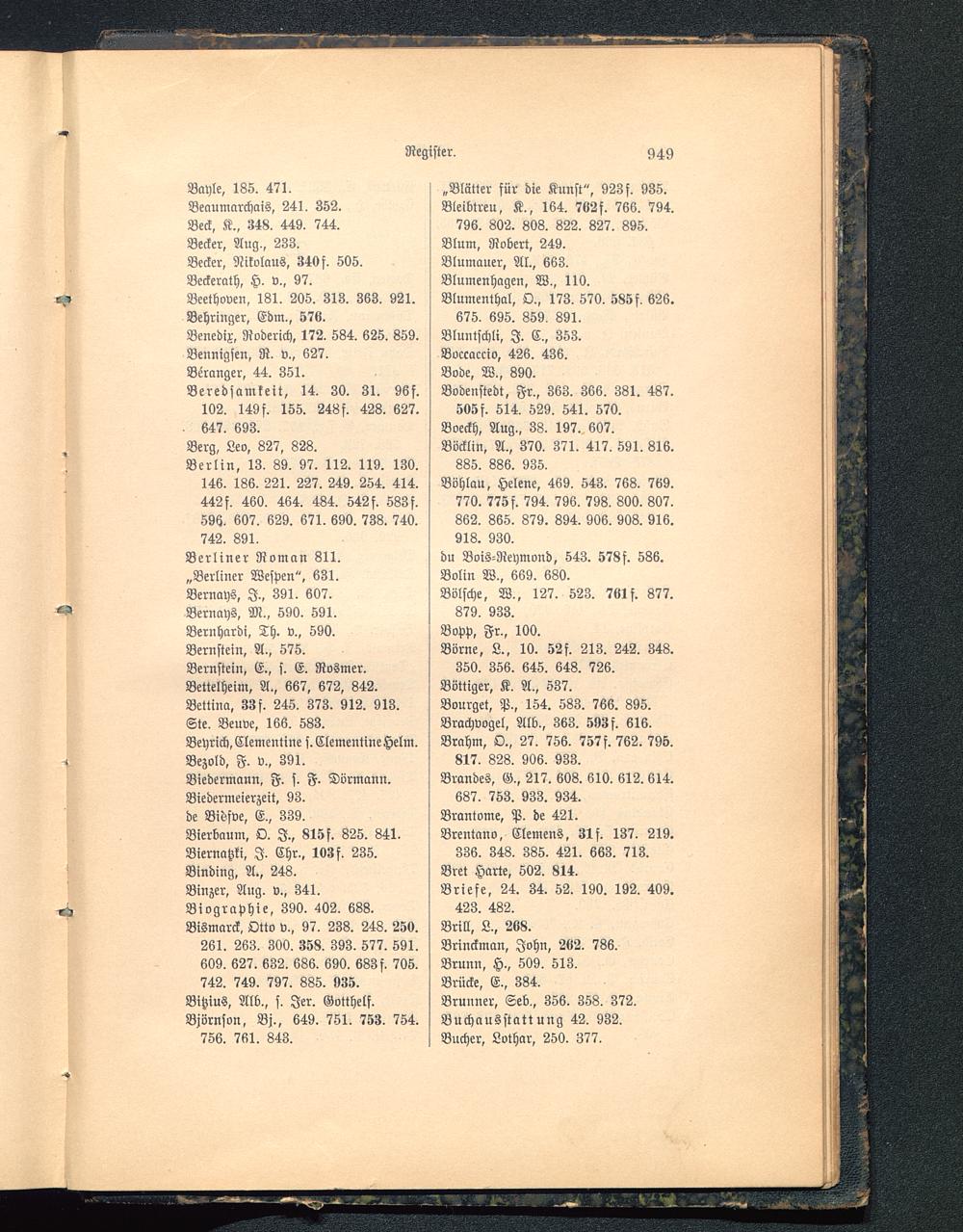 742. 891.Berliner Roman 811.„Berliner Wespen", 631.Bernays , I., 391. 607.Bernays, M. , 590. 591.Bernhard!, Th. v., 590.Bernstein, A., 575.Bernstein, E., s. E. Rosmer.Bettelheim, A., 667, 672, 842.Bettina, 33 f. 245. 373. 912. 913.Sie. Beuve, 166. 583.Beyrich, Clementine s. Clementine Helm .Bezold, F. v.. 391.Biedermann, F. s. F. Dvrmann.Biedermeierzeit, 93.de Bidfve, E., 339.Bierbaum, O. I., 815f. 825. 841.Biernatzki, I. Chr.. 103 f. 235.Binding, A., 248.Binzer, Aug. v., 341.Biographie, 390. 402. 688.Bismarck , Otto v., 97. 238. 248. 25«.