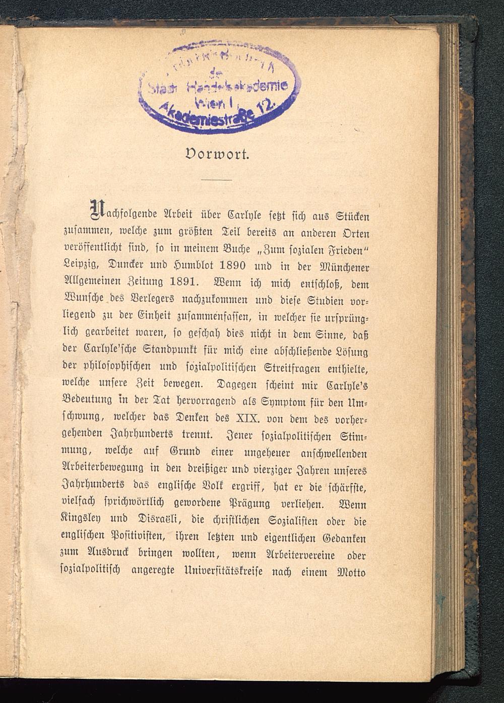 Al-achfolgende Arbeit über Carlvle setzt sich aus Stückenzusammen, welche zum größten Teil bereits an anderen Ortenveröffentlicht sind, so in meinem Buche „Zum sozialen Frieden"Leipzig, Duncker und Humblot 1890 und in der MünchenerAllgemeinen Zeitung 1891. Wenn ich mich entschloß, demWunsche des Verlegers nachzukommen und diese Studien vor-liegend zu der Einheit zusammenfassen, in welcher sie ursprüng-lich gearbeitet waren, so geschah dies nicht in dem Sinne, daßder Carlyle'sche Standpuukt für mich eine abschließende Lösungder philosophischen und sozialpolitischen Streitfragen enthielte,welche unsere Zeit bewegen. Tagegen scheint mir Carlnle'sBedeutung in der Tat hervorragend als Symptom für den Um-schwung, welcher das Denken des XIX. von dem des vorher-gehenden Jahrhunderts trennt. Jener sozialpolitischen Stim-mung, welche auf Grund einer ungeheuer anschwellendenArbeiterbewegung in den dreißiger und vierziger Jahren unseresJahrhunderts das englische Volk ergriff, hat er die schärfste,vielfach sprichwörtlich gewordene Prägung verliehen. WennKingslen und DiSraÄi, die christlichen Sozialisten oder dieenglischen Positivisten, ihren letzten und eigentlichen Gedankenzum Ausdruck bringen wollten, wenn Arbeitervereine odersozialpolitisch augeregte Uuiversitätskreise nach einem Motto