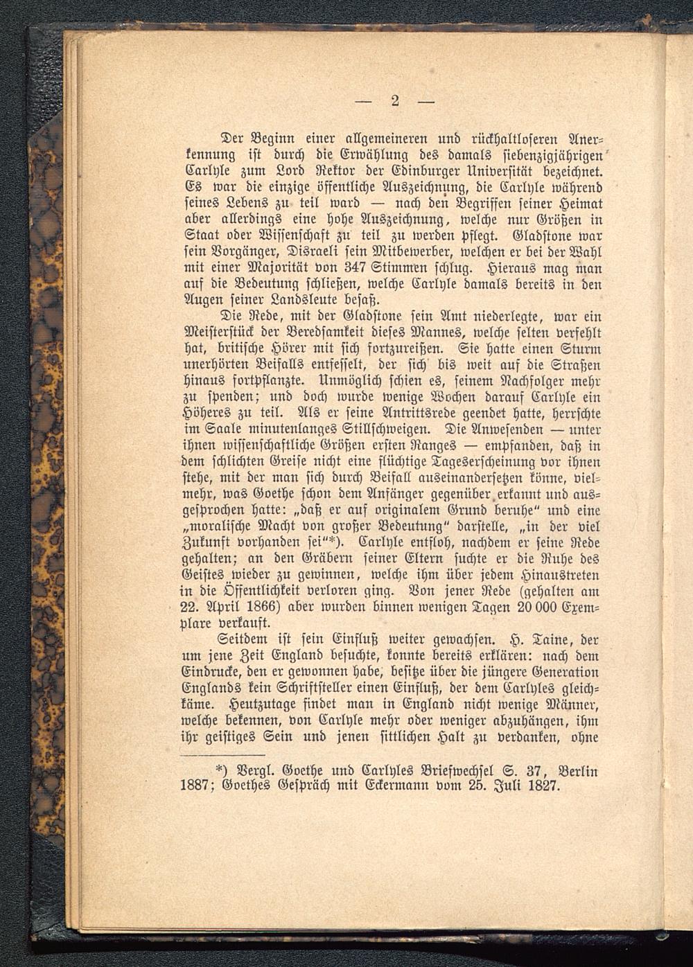 Der Beginn einer allgemeineren und rückhaltloseren Aner-kennung ist durch die Erwählung des damals siebenzigjährigenCarlyle zum Lord Rektor der Edinburger Universität bezeichnet.Es war die einzige öffentliche Auszeichnung, die Carlyle währendseines Lebens zu teil ward — nach den Begriffen seiner Heimataber allerdings eine hohe Auszeichnung, welche nur Größen inStaat oder Wissenschaft zu teil zu werden Pflegt. Gladstone warsein Vorgänger, Disraeli sein Mitbewerber, welchen er bei der Wahlmit einer Majorität von 347 Stimmen schlug. Hieraus mag manauf die Bedeutung schließen, welche Carlyle damals bereits in denAugen seiner Landsleute besaß.