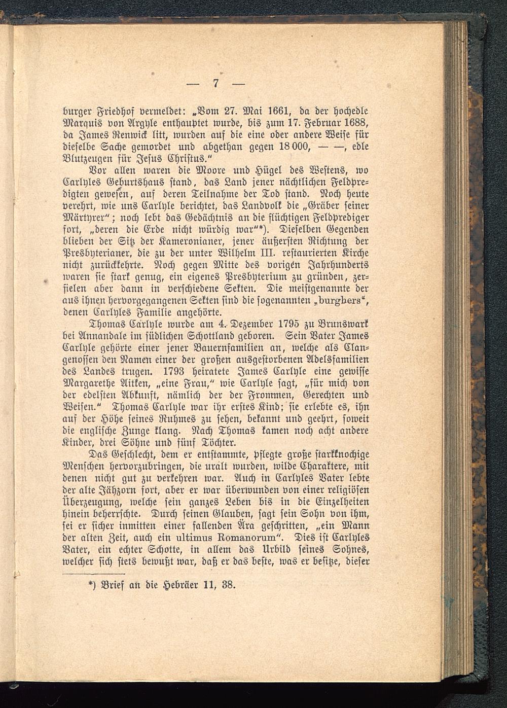 Vor allen waren die Moore und Hügel des Westens, woCarlyles Geburtshaus stand, das Land jener nächtlichen Feldpre-digten gewesen, auf deren Teilnahme der Tod stand. Noch heuteverehrt, wie uns Carlyle berichtet, das Landvolk die „Gräber seinerMärtyrer"; noch lebt das Gedächtnis an die flüchtigen Feldpredigerfort, „deren die Erde nicht würdig war"*). Dieselben Gegendenblieben der Sitz der Kameronianer, jener äußersten Richtung derPresbyterianer, die zu der unter Wilhelm III. restaurierten Kirchenicht zurückkehrte. Noch gegen Mitte des vorigen Jahrhundertswaren sie stark genug, ein eigenes Presbyterium zu gründen, zer-fielen aber dann in verschiedene Sekten. Die meistgenannte deraus ihnen hervorgegangenen Sekten sind die sogenannten „ durZKsrs",denen Carlyles Familie angehörte.