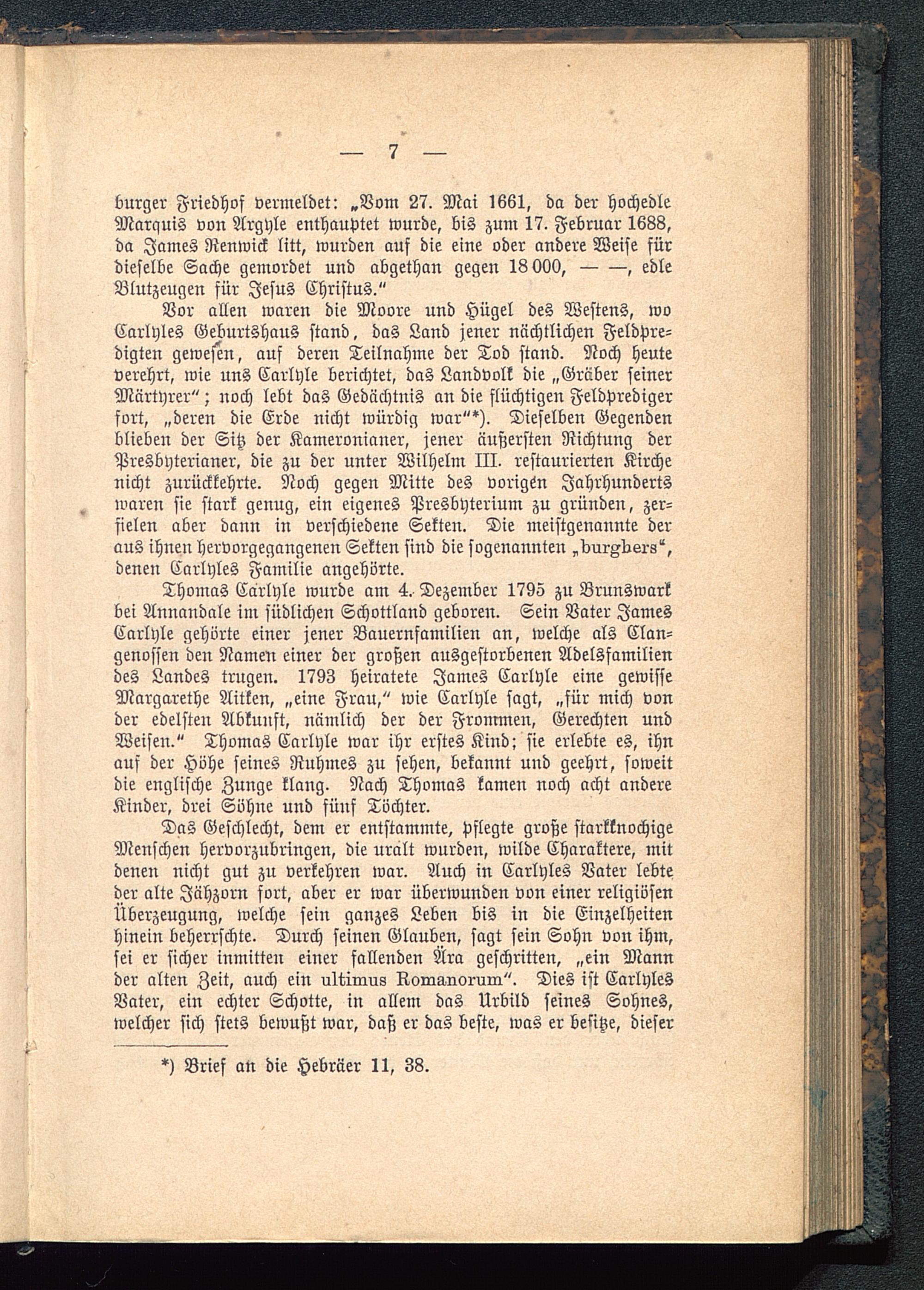 Thomas Carlyle wurde am 4. Dezember 1793 zu Brunswarkbei Annandale im südlichen Schottland geboren. Sein Vater JamesCarlyle gehörte einer jener Bauernfamilien an, welche als Clan-genossen den Namen einer der großen ausgestorbenen Adelsfamiliendes Landes trugen. 1793 heiratete James Carlyle eine gewisseMargarethe Aitken, „eine Frau," wie Carlyle sagt, „für mich vonder edelsten Abkunft, nämlich der der Fronnnen, Gerechten undWeisen." Thomas Carlyle war ihr erstes Kind; sie erlebte es, ihnauf der Höhe seines Ruhmes zu sehen, bekannt und geehrt, soweitdie englische Zunge klang. Nach Thomas kamen noch acht andereKinder, drei Söhne und fünf Töchter.