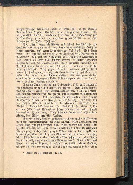 Das Geschlecht, dem er entstammte. Pflegte große starkknochigeMenschen hervorzubringen, die uralt wurden, wilde Charaktere, mitdenen nicht gut zu verkehren war. Auch in Carlyles Vater lebteder alte Jähzorn fort, aber er war überwunden von einer religiösenÜberzeugung, welche sein ganzes Leben bis in die Einzelheitenhinein beherrschte. Durch seinen Glauben, sagt sein Sohn von ihm,sei er sicher inmitten einer fallenden Ära geschritten, „ein Mannder alten Zeit, auch ein ultimus Rowa-norura". Dies ist CarlylesVater, ein echter Schotte, in allem das Urbild seines Sohnes,welcher sich stets bewußt war, daß er das beste, was er besitze, dieser