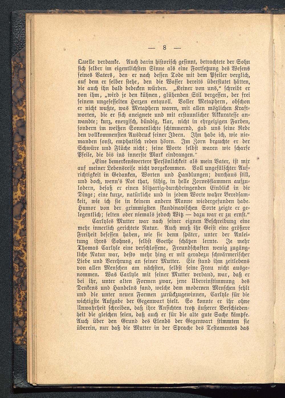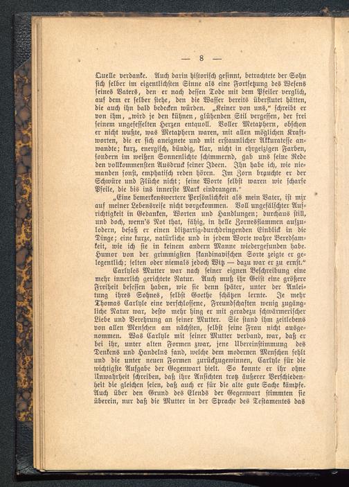 Carlyles Mutter war nach seiner eignen Beschreibung einemehr innerlich gerichtete Natur. Auch muß ihr Geist eine größereFreiheit besessen haben, wie sie denn später, unter der Anlei-tung ihres Sohnes, selbst Goethe schätzen lernte. Je mehrThomas Carlyle eine verschlossene, Freundschaften wenig zugäng-liche Natur war, desto mehr hing er mit geradezu schwärmerischerLiebe und Verehrung an seiner Mutter. Sie stand ihm zeitlebensvon allen Menschen am nächsten, selbst seine Frau nicht ausge-nommen. Was Carlhle mit seiner Mutter verband, war, daß erbei ihr, unter alten Formen zwar, jene Übereinstimmung desDenkens und Handelns fand, welche dem modernen Menschen fehltund die unter neuen Formen zurückzugewinnen, Carlyle für diewichtigste Aufgabe der Gegenwart hielt. So konnte er ihr ohneUnwahrheit schreiben, daß ihre Ansichten trotz äußerer Verschieden-heit die gleichen seien, daß auch er für die alte gute Sache kämpfe.Auch über den Grund des Elends der Gegenwart stimmten sieüberein, nur daß die Mutter in der Sprache des Testamentes das