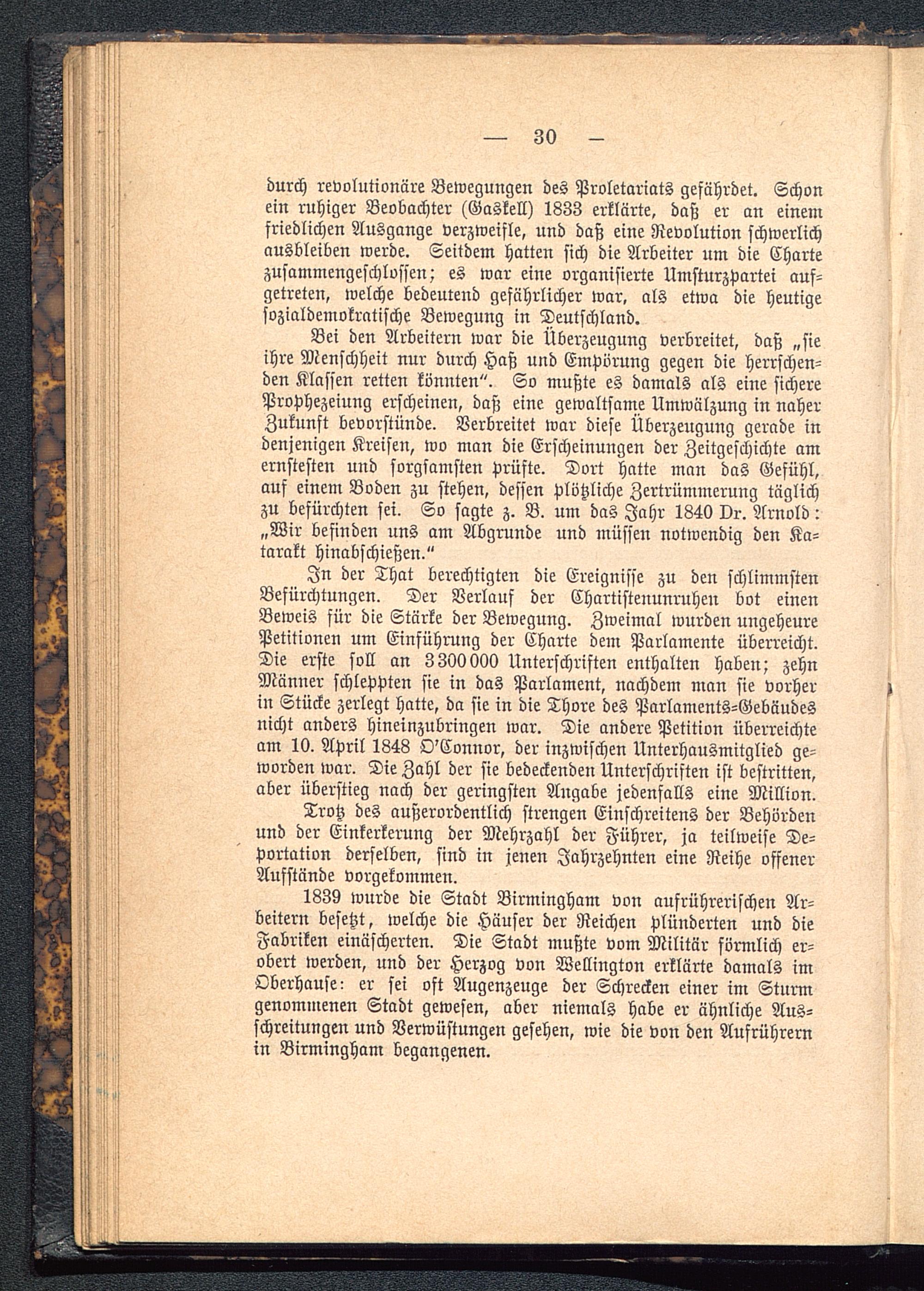 durch revolutionäre Bewegungen des Proletariats gefährdet. Schonein ruhiger Beobachter (Gaskell) 1833 erklärte, daß er an einemfriedlichen Ausgange verzweifle, und daß eine Revolution schwerlichausbleiben werde. Seitdem hatten sich die Arbeiter um die Chartezusammengeschlossen; es war eine organisierte Umsturzpartei auf-getreten, welche bedeutend gefährlicher war, als etwa die heutigesozialdemokratische Bewegung in Deutschland .