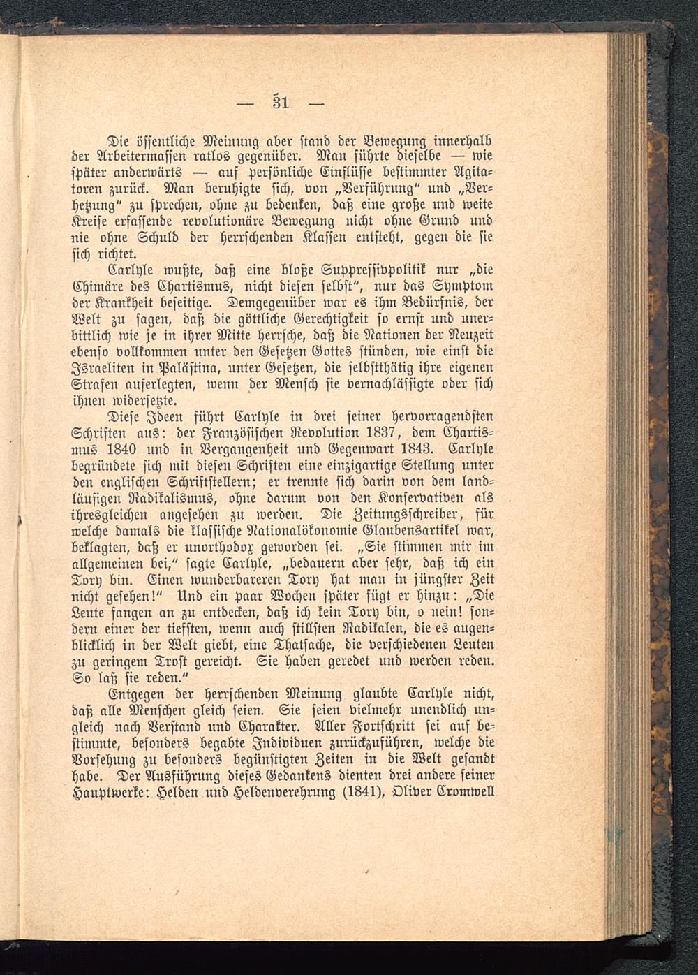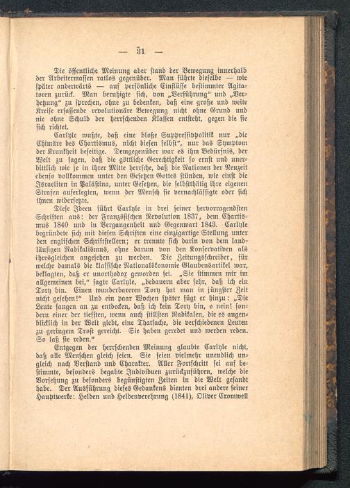 Entgegen der herrschenden Meinung glaubte Carlyle nicht,daß alle Menschen gleich seien. Sie seien vielmehr unendlich un-gleich nach Verstand nnd Charakter. Aller Fortschritt sei auf be-stimmte, besonders begabte Individuen zurückzuführen, welche dieVorsehung zu besonders begünstigten Zeiten in die Welt gesandthabe. Der Ausführung dieses Gedankens dienten drei andere seinerHauptwerke: Helden und Heldenverehrung (1341), Oliver Cromwell