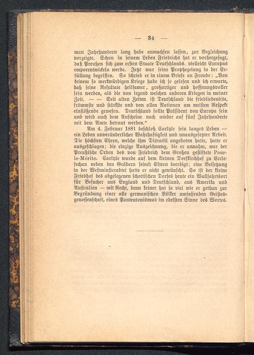 Am 4. Februar 188l beschloß Carlyle sein langes Leben —ein Leben unveränderlicher Wahrhaftigkeit und unausgesetzter Arbeit.Die höchsten Ehren, welche ihm Disrasli angeboten hatte, hatte erausgeschlagen; die einzige Auszeichnung, die er annahm, war derPreußische Orden des von Friedrich dem Großen gestiftete l?our-Is-Nsrits. Carlyle wurde auf dem kleinen Dorfkirchhof zu Eccle-fechan neben den Gräbern seiner Eltern beerdigt; eine Beisetzungin der Westminsterabtei hatte er nicht gewünscht. So ist der kleineFriedhof des abgelegenen schottischen Dorfes heute ein Wallfahrtsortfür Besucher aus England uud Deutschland, aus Amerika undAustralien — mit Recht, denn keiner hat so viel wie er gethan zurBegründung einer alle germanischen Völker umfassenden Geistes-genossenschaft, eines Panteutonismus im edelsten Sinne des Wortes.