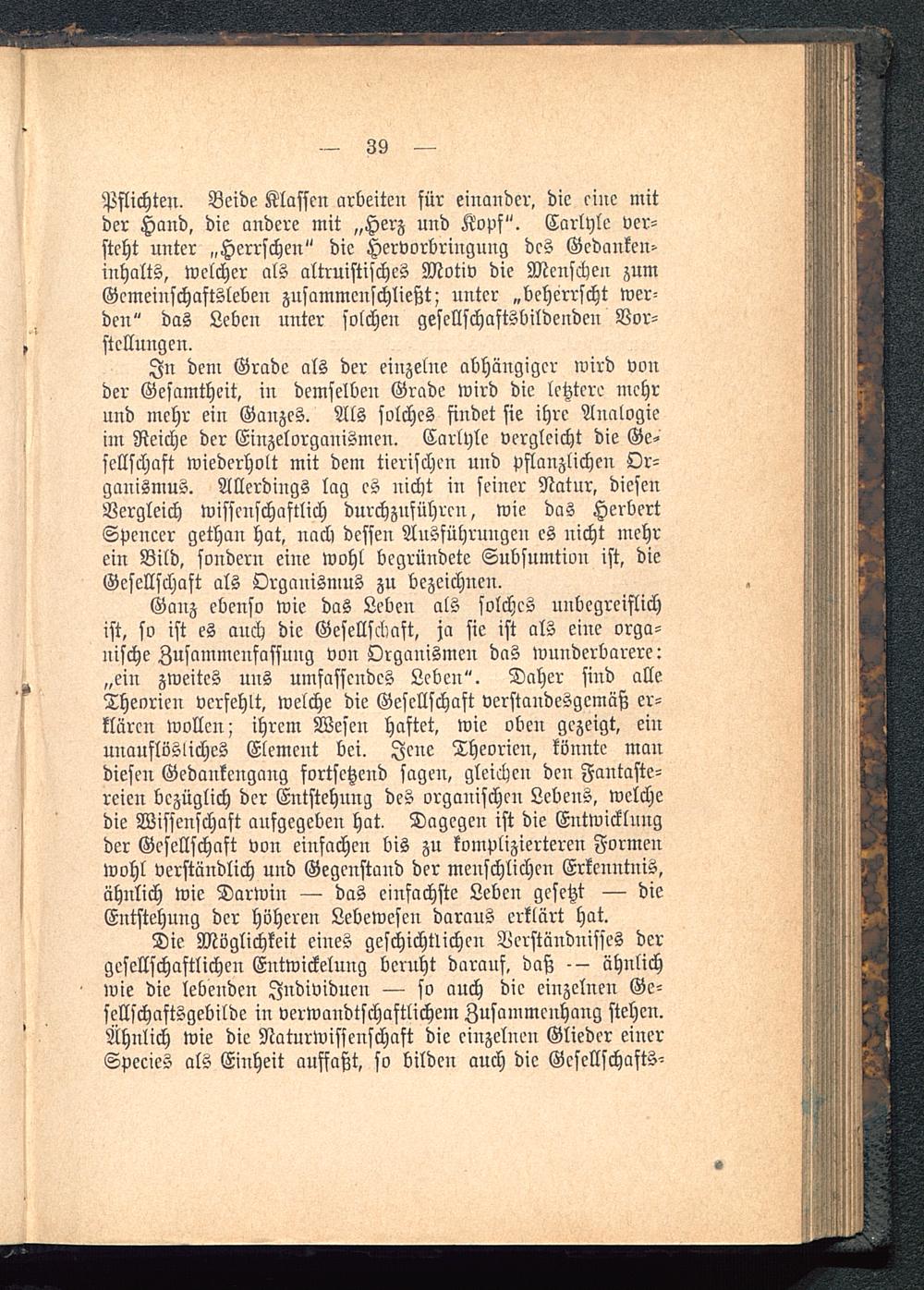 In deni Grade als der einzelne abhängiger wird vonder Gesamtheit, in demselben Grade wird die letztere mehrund mehr ein Ganzes. Als solches findet sie ihre Analogieim Reiche der Einzelorganismen. Carlyle vergleicht die Ge-sellschaft wiederholt mit dem tierischen und pflanzlichen Or-ganismus. Allerdings lag es nicht in seiner Natur, diesenVergleich wissenschaftlich durchzuführen, wie das HerbertSpeuccr gethan hat, nach dessen Ausführungen es nicht mehrein Bild, sondern eine wohl begründete Subsumtion ist, dieGesellschaft als Organismus zu bezeichnen.