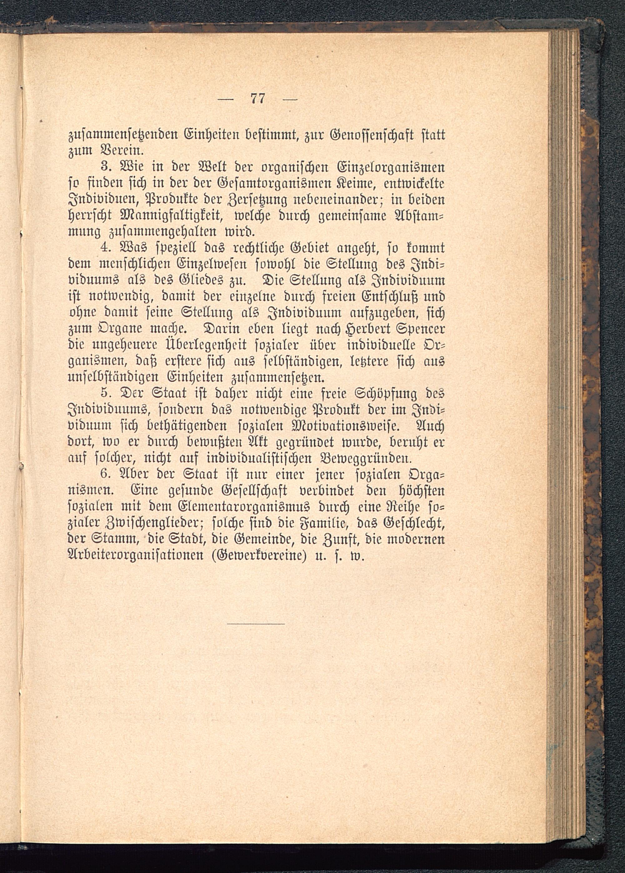 4. Was speziell das rechtliche Gebiet angeht, so kommtdem menschlichen Einzelwesen sowohl die Stellung des Indi-viduums als des Gliedes zu. Die Stellung als Individuumist notwendig, damit der einzelne durch freien Entschluß undohne damit seine Stellung als Individuum aufzugeben, sichzum Organe mache. Darin eben liegt nach Herbert Spencer die ungeheuere Überlegenheit sozialer über individuelle Or-ganismen, daß erstere sich aus selbständigen, letztere sich ausunselbständigen Einheiten zusammensetzen.