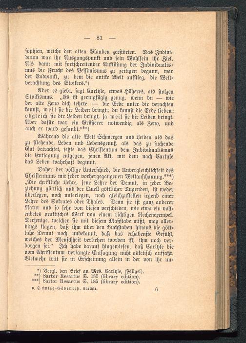 Während die alte Welt Schmerzen und Leiden als daszu fliehende, Leben und Lebensgenuß als das zu suchendeGut betrachtet, setzte das Christentum dem Individualismusdie Entsagung entgegen, jenen Akt, mit dem nach Carlyledas Leben wahrhaft beginnt.