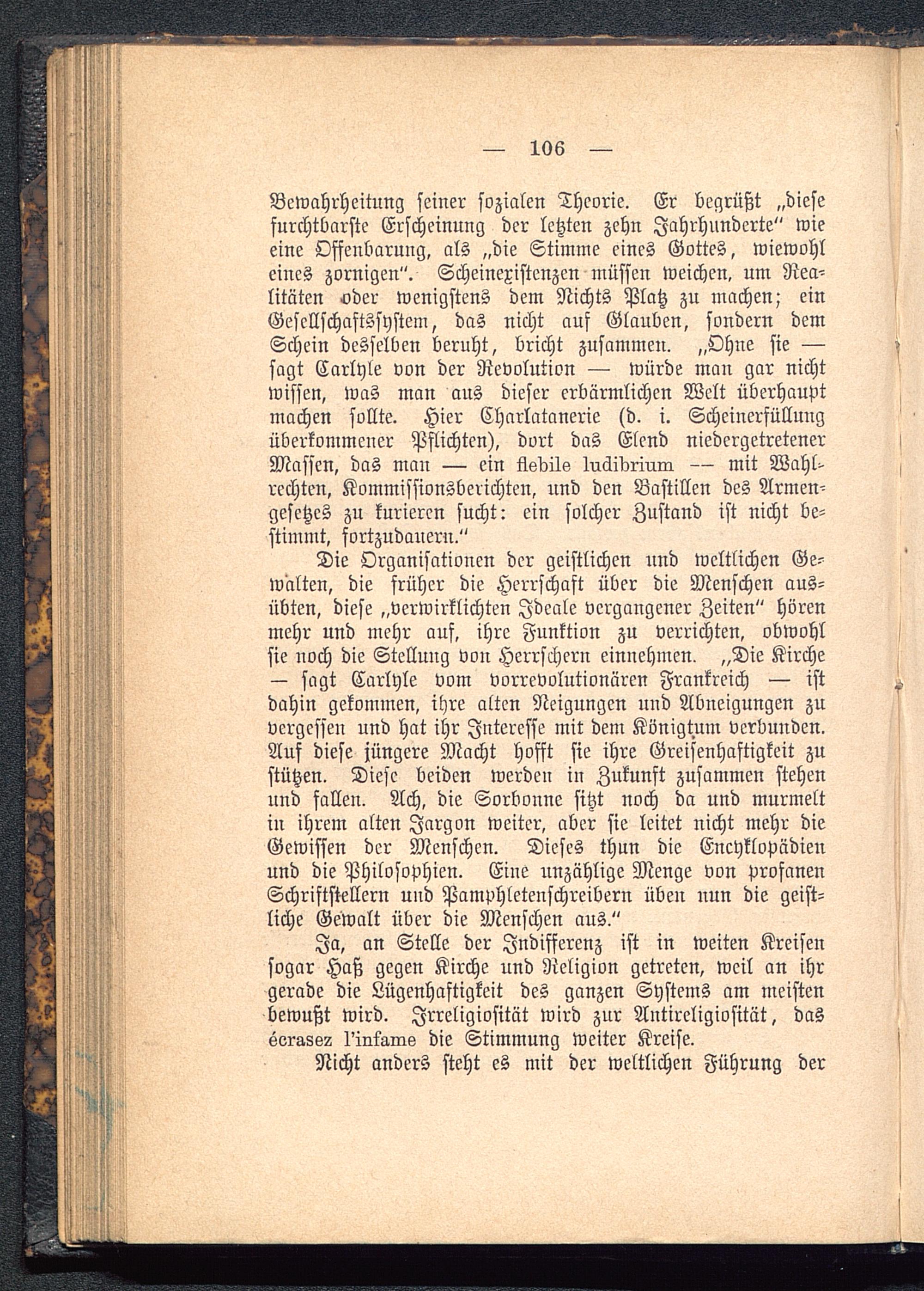 Die Organisationen der geistlichen nnd weltlichen Ge-walten, die früher die Herrschaft über die Menschen aus-übten, diese „verwirklichten Ideale vergangener Zeiten" hörenmehr und mehr auf, ihre Funktion zu verrichten, obwohlsie noch die Stellung von Herrschern einnehmen. „Die Kirche— sagt Carlyle vom vorrevolutionären Frankreich — istdahin gekommen, ihre alten Neigungen und Abueigungen zuvergessen und hat ihr Interesse mit dem Königtum verbunden.Auf diese jüngere Macht hofft sie ihre Greisenhaftigkeit zustützen. Diese beiden werden in Zukunft zusammen stehennnd fallen. Ach, die Sorbonne sitzt noch da und murmeltiu ihrem alten Jargon weiter, aber sie leitet nicht mehr dieGewissen der Menschen. Dieses thun die Encyklopädienund die Philosophien. Eine unzählige Menge von profanenSchriftstellern uud Pamphletenschreibern üben nun die geist-liche Gewalt über die Menschen aus."