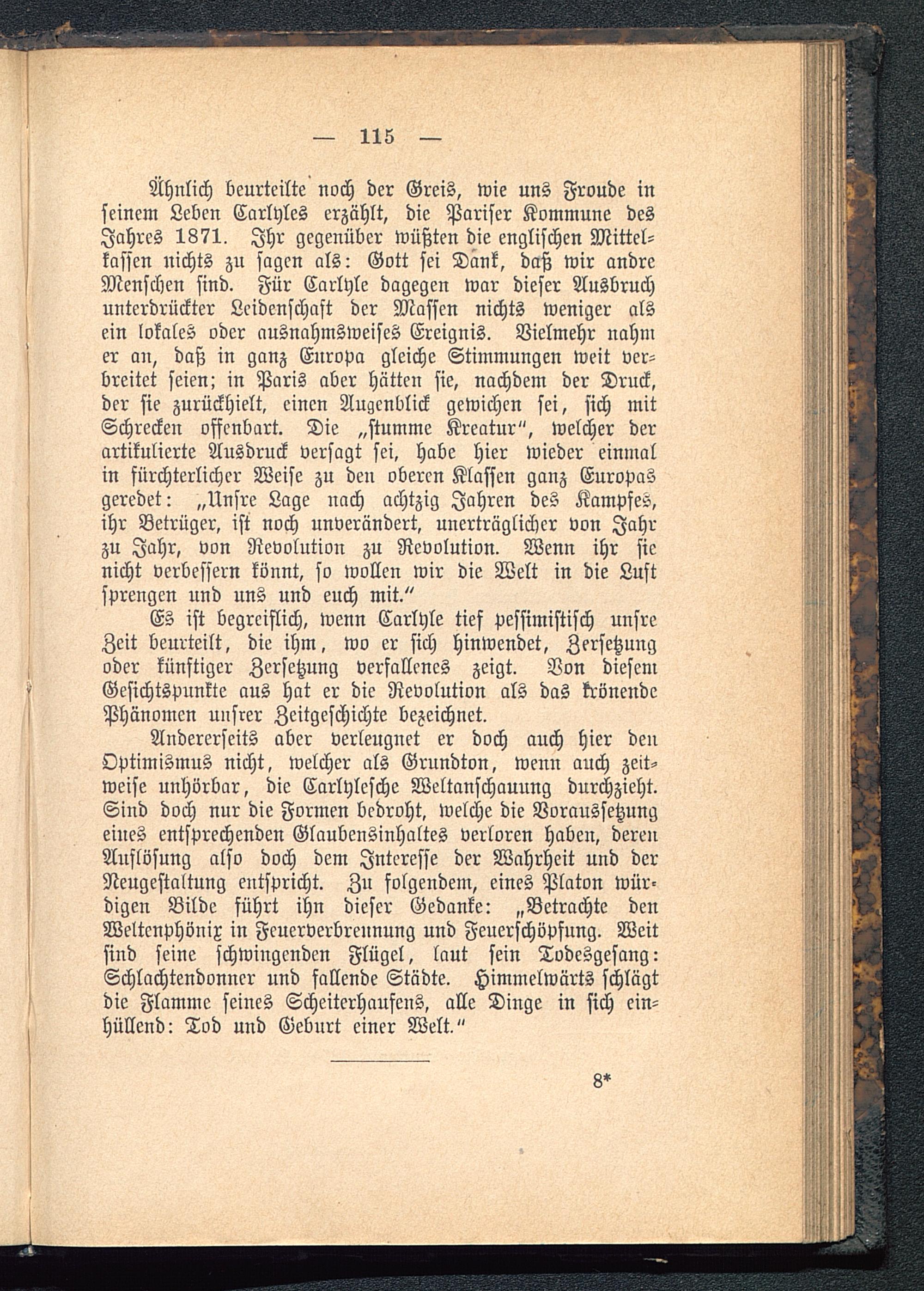 Andererseits aber verleugnet er doch auch hier denOptimismus nicht, welcher als Grundton, wenn auch zeit-weise unhörbar, die Carlylesche Weltanschauung durchzieht.Sind doch nur die Formen bedroht, welche die Voraussetzungeines entsprechenden Glaubensinhaltes verloren haben, derenAuslösung also doch dem Interesse der Wahrheit und derNeugestaltung entspricht. Zu folgendem, eines Platon wür-digen Bilde führt ihn dieser Gedanke: „Betrachte denWeltenphönix in Fcuerverbreunung und Feuerschöpfung. Weitsind seine schwingenden Flügel, laut sein Tvdesgesang:Schlachtendonncr und fallende Städte. Himmelwärts schlägtdie Flamme seines Scheiterhaufens, alle Dinge in sich ein-hüllend: Tod und Geburt einer Welt."