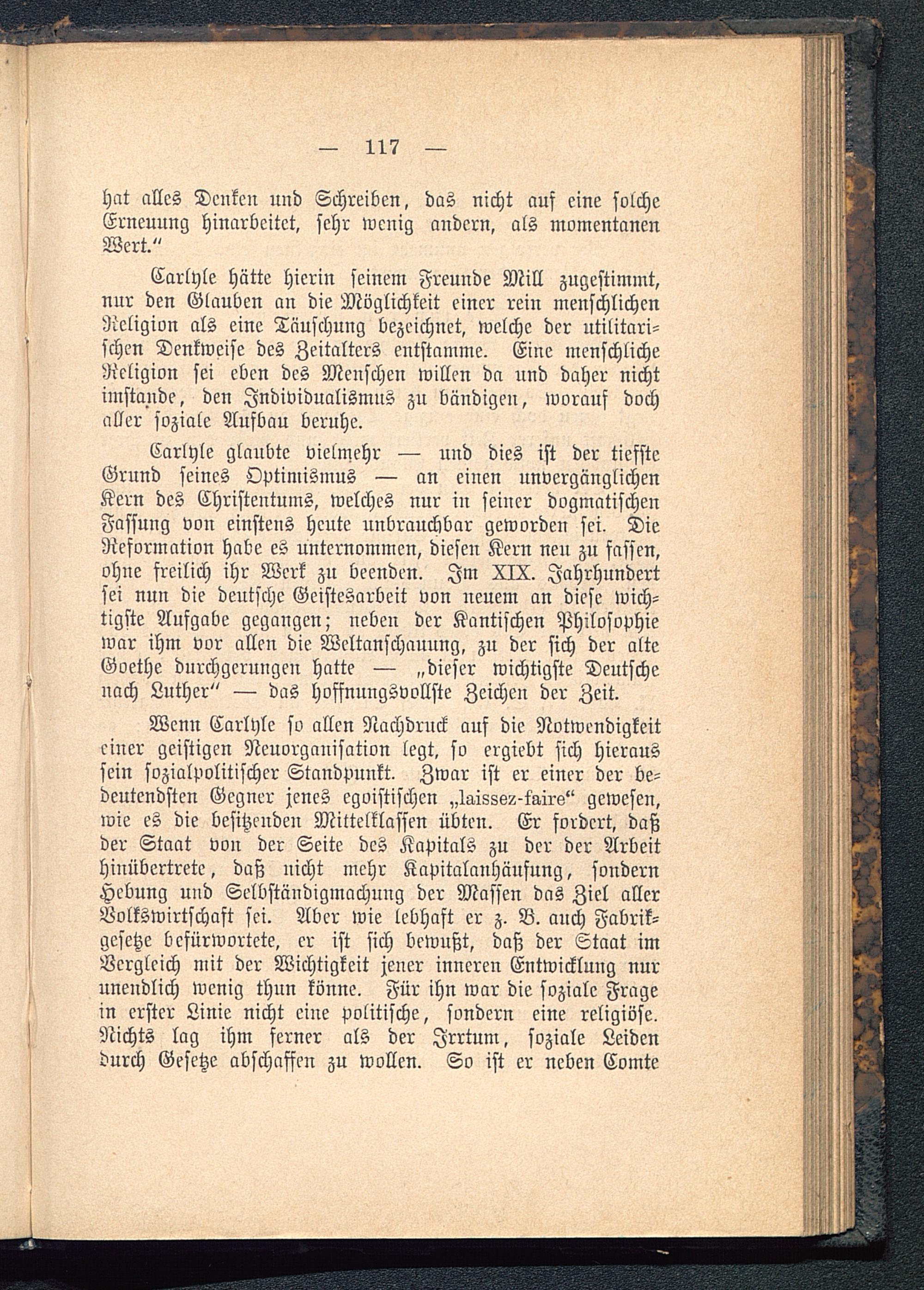 Carlhle hätte hierin seinem Freunde Mill zugestimmt,nur den Glauben an die Möglichkeit einer rein menschlichenReligion als eine Täuschung bezeichnet, welche der utilitari-schen Denkweise des Zeitalters entstamme. Eine menschlicheReligion sei eben des Menschen willen da nnd daher nichtimstande, den Individualismus zu bändigen, worauf dochaller soziale Aufbau beruhe.