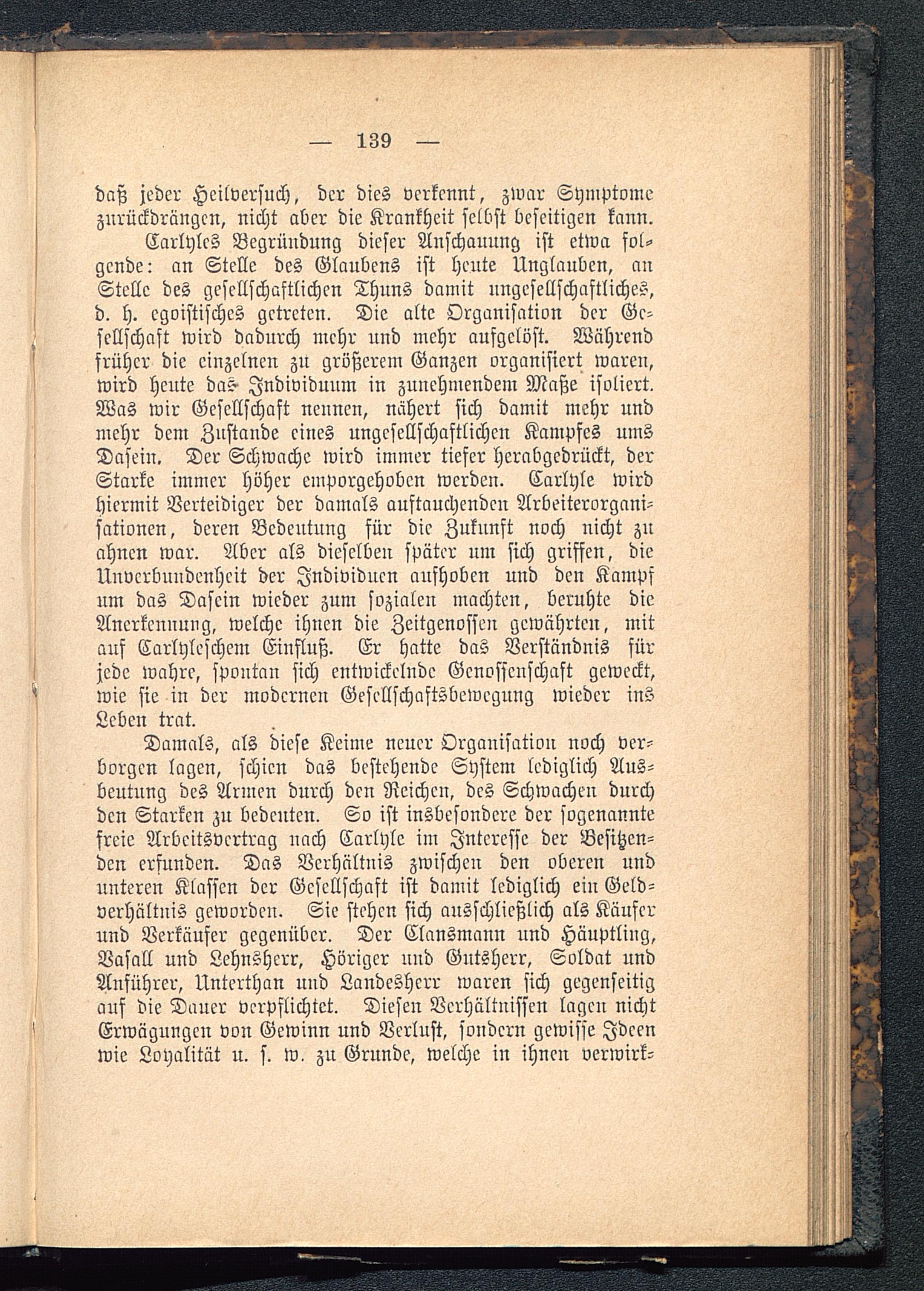 Damals, als diese Keime neuer Organisation noch ver-borgen lagen, schien das bestehende System lediglich Aus-beutung des Armen durch den Reichen, des Schwachen durchden Starken zu bedeuten. So ist insbesondere der sogenanntefreie Arbcitsvertrag nach Carlyle im Interesse der Besitzen-den erfunden. Das Verhältnis zwischen den oberen undunteren Klassen der Gesellschaft ist damit lediglich ein Geld-verhältuis geworden. Sie stehen sich ausschließlich als Käuferund Verkäufer gegenüber. Der Clansmann und Häuptling,Vasall und Lehnsherr, Höriger und Gutsherr, Soldat undAnführer, Unterthan und Landesherr waren sich gegenseitigauf die Dauer verpflichtet. Diesen Verhältnissen lagen nichtErwägungen von Gewinn und Verlust, sondern gewisse Ideenwie Loyalität n. s. w, zu Grunde, welche in ihnen verwirk-