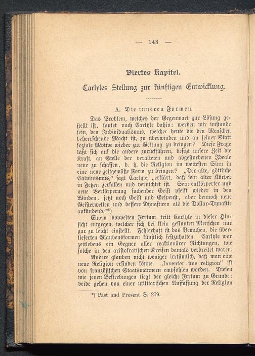 Einem doppelten Irrtum tritt Carlyle in dieser Hin-sicht entgegen, welcher sich bei klein gesinnten Menschen nurgar zu leicht einstellt. Fehlerhaft ist das Bemühen, die über-lieferten Glaubensformen künstlich festzuhalten. Carlyle warzeitlebens ein Gegner aller reaktionärer Richtungen, wiesolche in den aristokratischen Kreisen damals verbreitet waren.