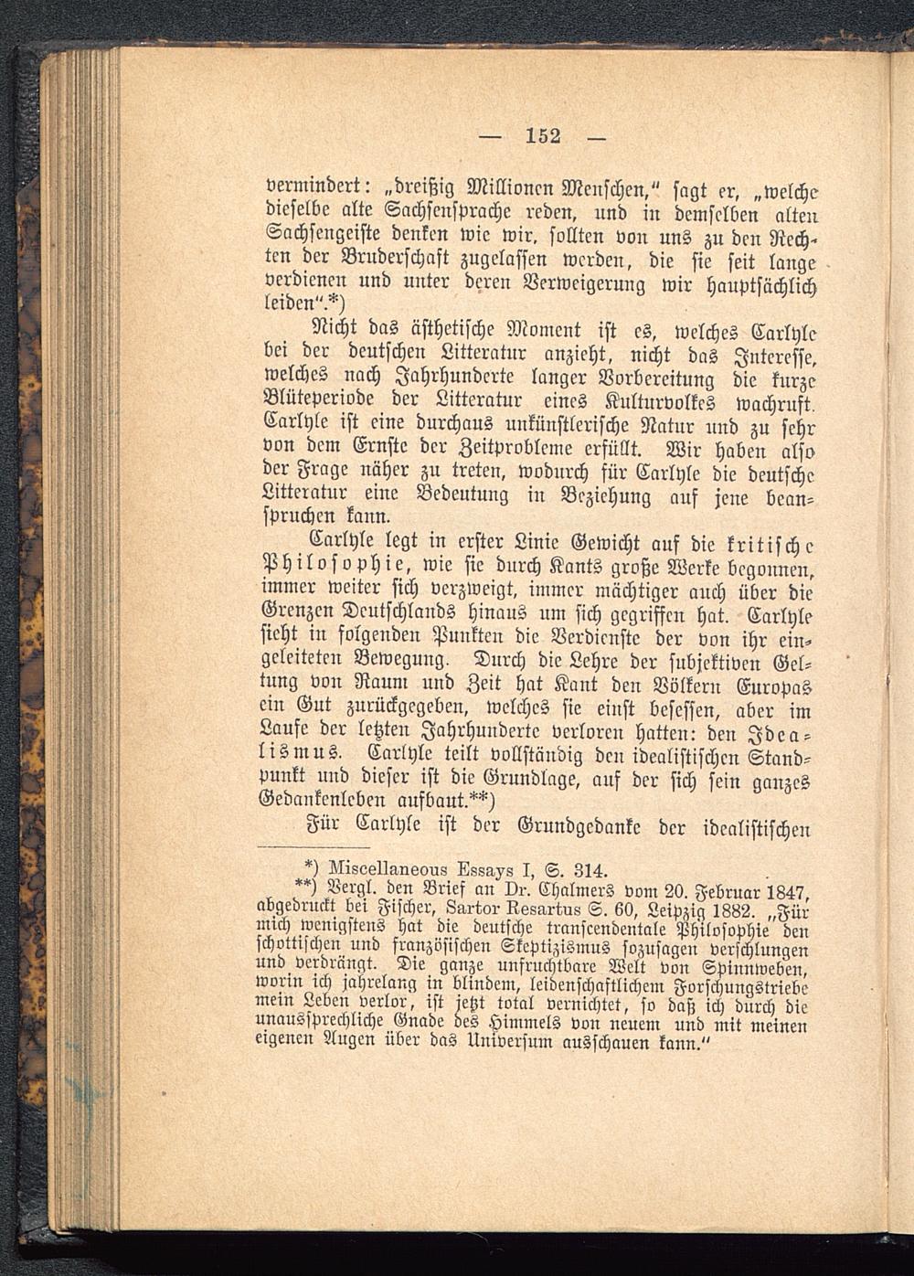 Carlyle legt in erster Linie Gewicht auf die kritischePhilosophie, wie sie durch Kants große Werke begonnen,immer weiter sich verzweigt, immer mächtiger auch über dieGrenzen Deutschlands hinaus um sich gegriffen hat. Carlylesieht in folgenden Punkten die Verdienste der von ihr ein-geleiteten Bewegung. Durch die Lehre der subjektiven Gel-tung von Raum und Zeit hat Kant den Völkern Europas ein Gut zurückgegeben, welches sie einst besessen, aber imLaufe der letzten Jahrhunderte verloren hatten: den Idea-lismus. Carlyle teilt vollständig den idealistischen Stand-punkt und dieser ist die Grundlage, ans der sich sein ganzesGedankenlcben aufbaut.**)