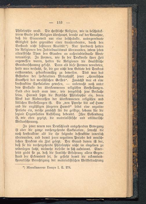Philosophie uralt. Die christliche Religion, wie in beschränk-terem Grade jede Religion überhaupt, beruht auf der Annahme,daß die Sinncnwclt nnr eine beschränkte, untergeordneteGittigkeit habe gegenüber einer transcendenten, durch denVerstand nicht faßbaren Realität*) Nur hierdurch hattendie Religionen den Individualismus übcUvnnden, indem jedesaltruistische Thun den Glauben an anßcrindividuelle Wertevoraussetzt. In Formen, wie sie der Denkweise ihrer Zeitangemessen waren, hatten die Religionen die idealistischeGrnndanschauung gefaßt. Dann als diese Formen veralteten,hatte man versucht, sie, die gar nicht dem Gebiete des Denkensentstammten, gcdaukcnmäßig zu beweisen. Dies war dasBestreben der spekulativen Metaphysik, jener „chronischenKrankheit des menschlichen Geistes". Zunächst war es einekonstruktive Spekulation gewesen, — unbewußt noch unterdem Einflüsse der überkommenen religiösen Vorstellungeu.Bald aber ward man innc, wie vergeblich jene Versucheseien. Hiermit setzte die skeptische Philosophie ein, derenWerk das Niederreißen der überkommenen religiösen undsittlichen Vorstellungen ist. Sie „von Pyrrho bis auf Hume und die unzähligen jüngeren Humes" leitet eine negativePeriode ein, welche zunächst für die geistige, sodann für diesoziale Organisation Auflösung bedeutet. Ihre Vollendungist, wie obeu gezeigt, die materialistische und ntilitarischeWeltanschauung.