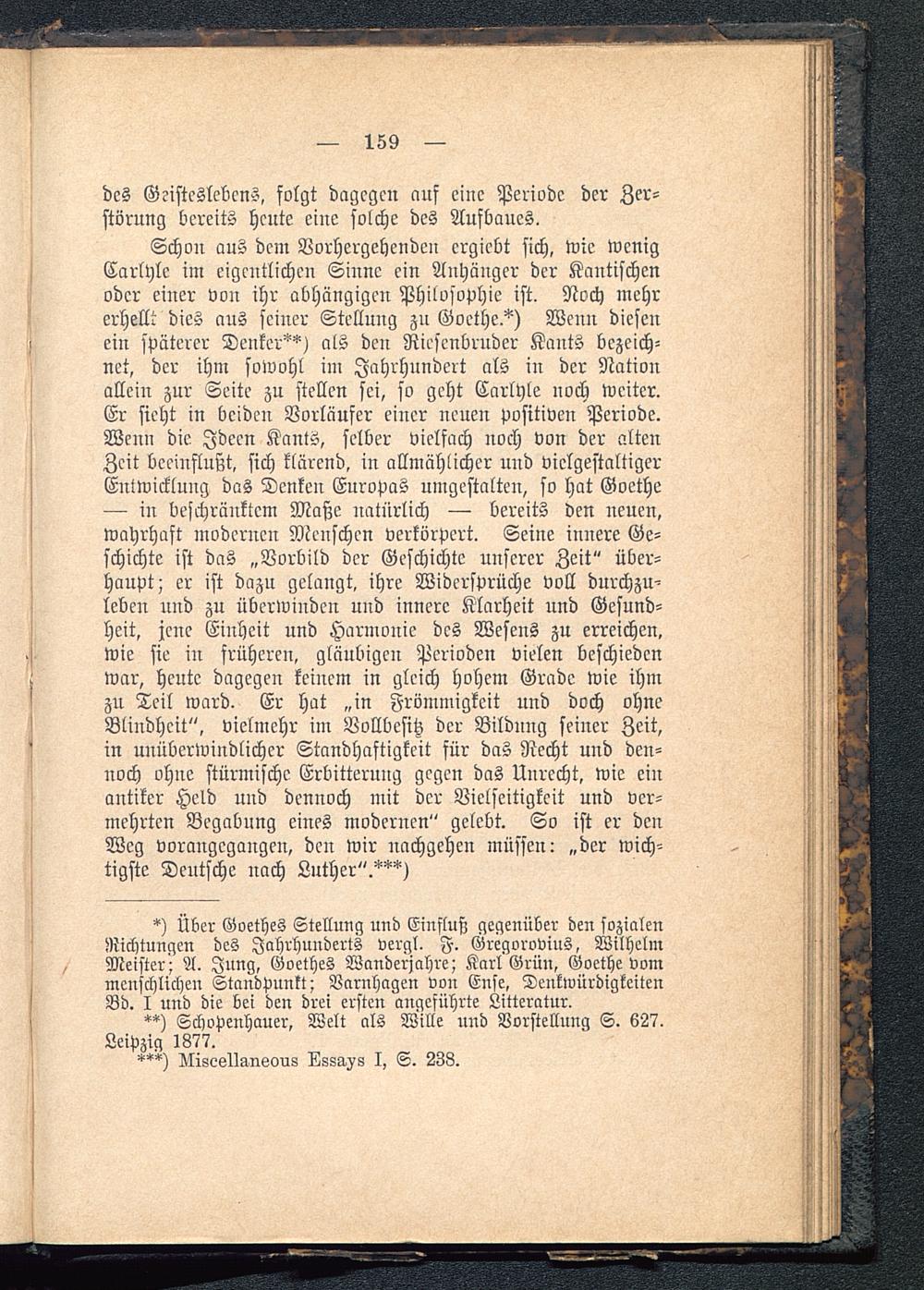 Schon aus dem Vorhergehenden crgicbt sich, wie wenigCarlyle im eigentlichen Sinne ein Anhänger der Kantischenoder einer von ihr abhängigen Philosophie ist. Noch mehrerhellt dies aus seiner Stellung zn Goethe.*) Wenn diesenein späterer Denker**) als den Riesenbruder Kants bezeich-net, der ihm sowohl im Jahrhundert als in der Nationallein zur Seite zu stellen sei, so geht Carlyle noch weiter.Er sieht in beiden Vorläufer eiucr neuen positiven Periode.Wenn die Ideen Kants, selber vielfach noch von der altenZeit beeinflußt, sich klärend, in allmählicher uud vielgestaltigerEutwickluug das Denken Europas umgestalten, so hat Goethe— iu beschränktem Maße natürlich — bereits den neuen,wahrhaft modernen Menschen verkörpert. Seine innere Ge-schichte ist das „Vorbild der Geschichte unserer Zeit" über-haupt; er ist dazu gelangt, ihre Widersprüche voll durchzu^leben und zu überwinden und innere Klarheit und Gesund-heit, jene Einheit und Harmonie des Wesens zu erreichen,wie sie in früheren, gläubigen Perioden vielen beschiedcnwar, heute dagegen keinem in gleich hohem Grade wie ihmzu Teil ward. Er hat „in Frömmigkeit und doch ohneBliudhcit", vielmehr im Vollbesitz der Bildung seiner Zeit,in unüberwindlicher Sündhaftigkeit für das Recht und den-noch ohne stürmische Erbitterung gegen das Unrecht, wie einantiker Held uud dennoch mit der Vielseitigkeit und ver-mehrten Begabung eines modernen" gelebt. So ist er denWeg vorangegangen, den wir nachgehen müssen: „der wich-tigste Deutsche nach Luther".***)