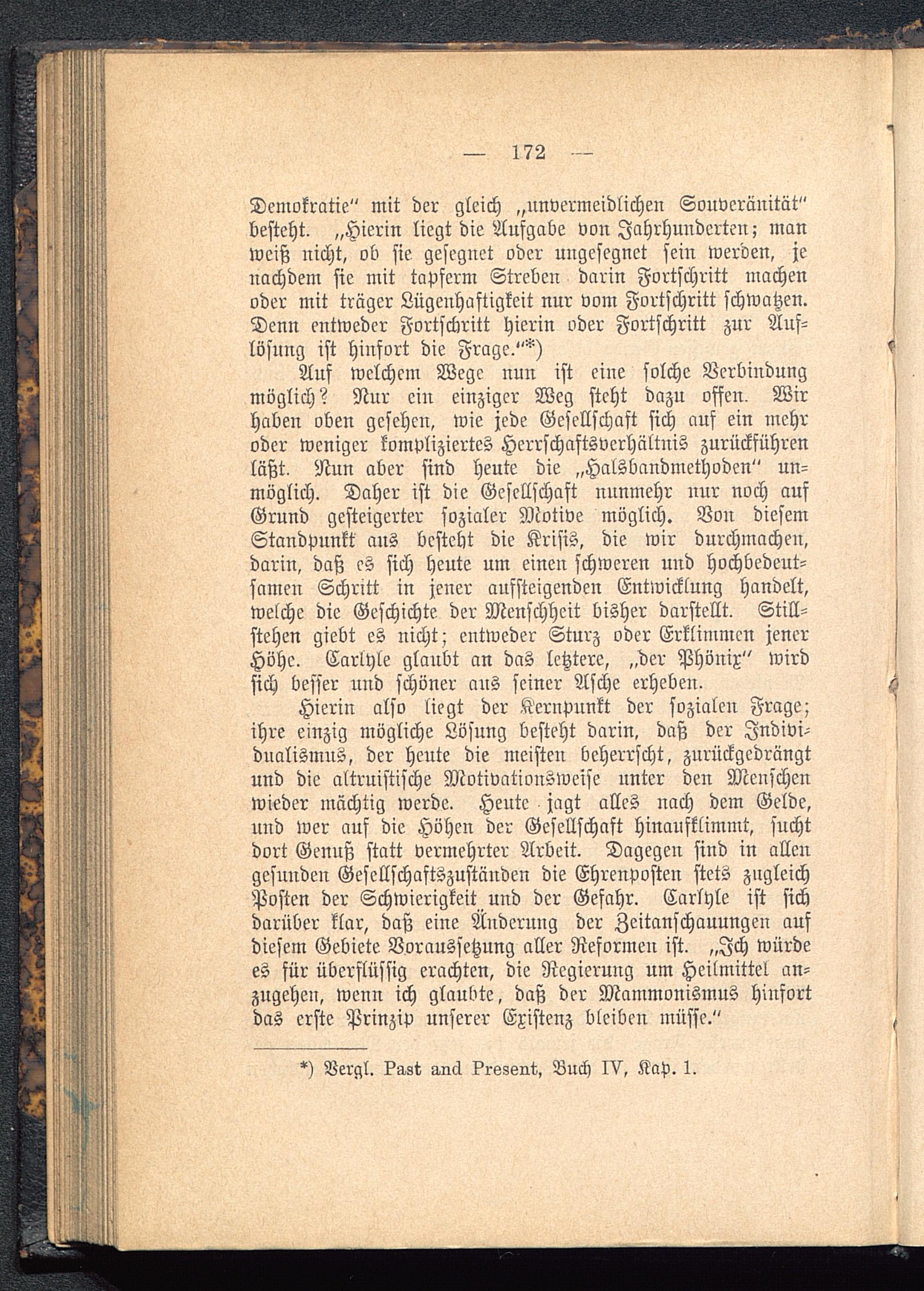 Auf welchem Wege nun ist eine solche Verbindungmöglich? Nur ciu einziger Weg steht dazu offen. Wirhaben oben gesehen, wie jede Gesellschaft sich auf ein mehroder weniger kompliziertes Herrschaftsvcrhältnis zurückführenläßt. Nun aber sind heute die „Halsbandmethodcn" un-möglich. Daher ist die Gesellschaft nnnmehr nur noch aufGrund gesteigerter sozialer Motive möglich. Von diesemStandpunkt ans besteht die Krisis, die wir durchmachen,darin, daß es sich heute um eineu schweren und hochbedeut-samen Schritt in jener aufsteigenden Entwicklung handelt,welche die Geschichte der Menschheit bisher darstellt. Still-stehen giebt es nicht; entweder Sturz oder Erklimmen jenerHöhe. Carlyle glaubt an das letztere, „der Phönix" wirdsich besser und schöner aus seiner Asche erheben.