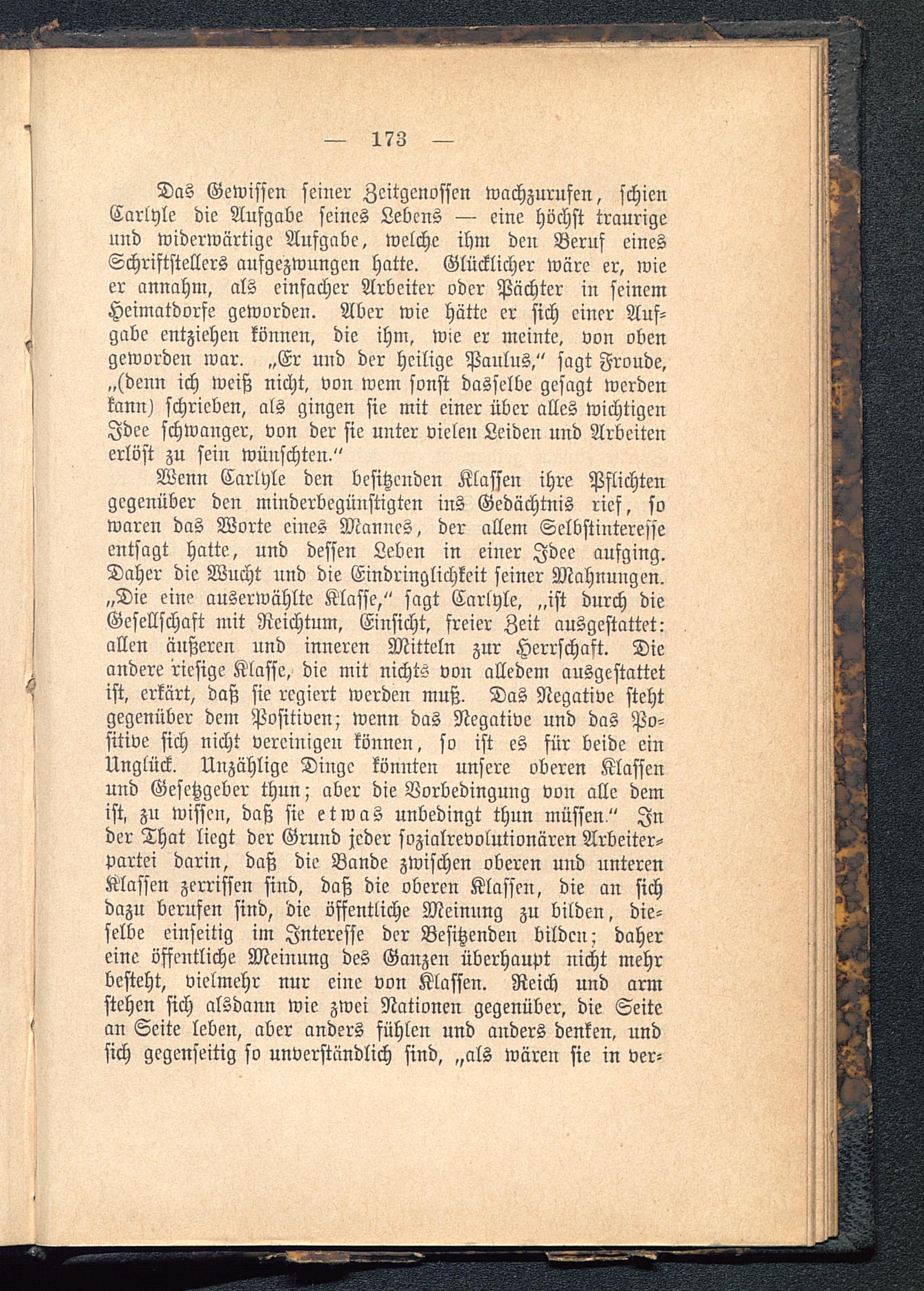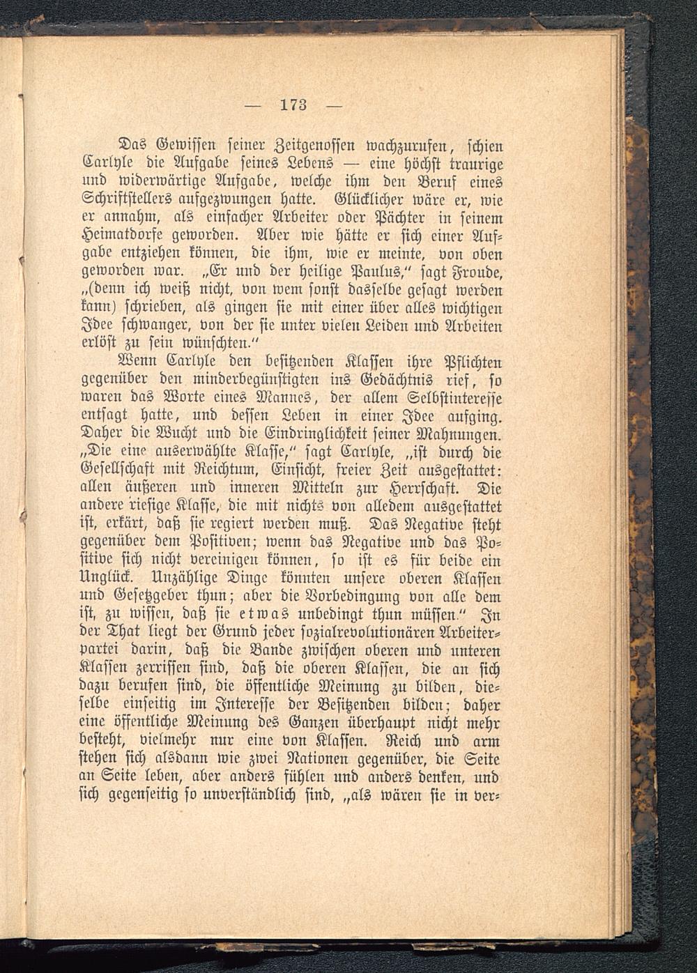 Wenn Carlyle den besitzenden Klassen ihre Pflichtengegenüber den minderbcgünstigten ins Gedächtnis rief, sowaren das Worte eines Mannes, der allem Selbstinteresseentsagt hatte, und dessen Leben in einer Idee aufging.Daher die Wucht und die Eindringlichkeit seiner Mahnungen.„Die eine auserwählte Klasse," sagt Carlyle, „ist durch dieGesellschaft mit Reichtum, Einsicht, freier Zeit ausgestattet:allen äußeren und inneren Mitteln zur Herrschaft. Dieandere riesige Klasse, die mit nichts von alledem ausgestattetist, erkärt, daß sie regiert werden muß. Das Negative stehtgegenüber dem Positiven; wenn das Negative und das Po-sitive sich nicht vereinigen können, so ist es für beide einUnglück. Unzählige Dinge könnten unsere oberen Klassenund Gesetzgeber thun; aber die Vorbedingung von alle demist, zu wissen, daß sie etwas unbedingt thun müssen" Inder That liegt der Grund jeder sozialrevolutionären Arbeiter-partei darin, daß die Bande zwischen oberen uud unterenKlassen zerrissen sind, daß die oberen Klassen, die an sichdazu berufen sind, die öffentliche Meinung zu bilden, die-selbe einseitig im Interesse der Besitzenden bilden; dahereine öffentliche Meinung des Ganzen überhaupt nicht mehrbesteht, vielmehr nur eine von Klassen. Reich und armstehen sich alsdann wie zwei Nationen gegenüber, die Seitean Seite leben, aber anders fühlen und anders denken, undsich gegenseitig so unverständlich sind, „als wären sie in ver-