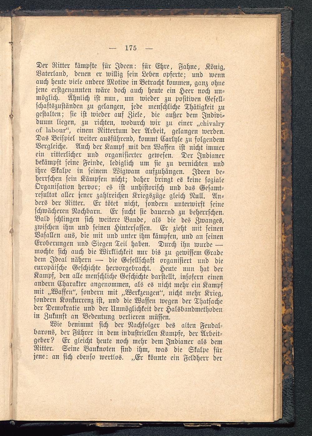Der Ritter kämpfte für Ideen: für Ehre, Fahne, König,Vaterland, denen er willig sein Leben opferte; und wennauch heute viele andere Motive in Betracht kommen, ganz ohnejene erstgenannten wäre doch auch heute ein Heer noch un-möglich. Ähnlich ist nun, um wieder zu positiven Gesell-schaftszuständen zu gelangen, jede menschliche Thätigkeit zugestalten; sie ist wieder auf Ziele, die außer dem Indivi-duum liegen, zu richten, wodurch wir zu einer „odivalr^ok ladour", einem Rittertum der Arbeit, gelangen werden.Das Beispiel weiter ausführend, kommt Carlyle zu folgendemVergleiche. Auch der Kampf mit den Waffen ist nicht immerein ritterlicher und organisierter gewesen. Der Indianerbekämpft seine Feinde, lediglich um sie zu vernichten undihre Skalpe in seinem Wigwam aufzuhängen. Ideen be-herrschen sein Kämpfen nicht; daher bringt es keine sozialeOrganisation hervor; es ist unhistorisch und das Gesamt-resultat aller jener zahlreichen Kriegszüge gleich Null. An-ders der Ritter. Er tötet nicht, sondern unterwirft seineschwächeren Nachbarn. Er sucht sie dauernd zu beherrschen.Bald schlingen sich weitere Bande, als die des Zwanges,zwischen ihm und seinen Hintersassen. Er zieht mit seinenVasallen aus, die mit und unter ihm kämpfen, und an seinenEroberungen uud Siegen Teil haben. Durch ihu wurde —mochte sich auch die Wirklichkeit nur bis zu gewissem Gradedem Ideal nähern — die Gesellschaft organisiert und dieeuropäische Geschichte hervorgebracht. Heute nnu hat derKampf, den alle menschliche Geschichte darstellt, insofern einenandern Charakter angenommen, als es nicht mehr ein Kampfmit „Waffen", sondern mit „Werkzeugen", nicht mehr Krieg,sondern Konkurrenz ist, und die Waffen wegen der Thatsacheder Demokratie und der Unmöglichkeit der Halsbandmethodenin Zukunft an Bedeutung verlieren müssen.