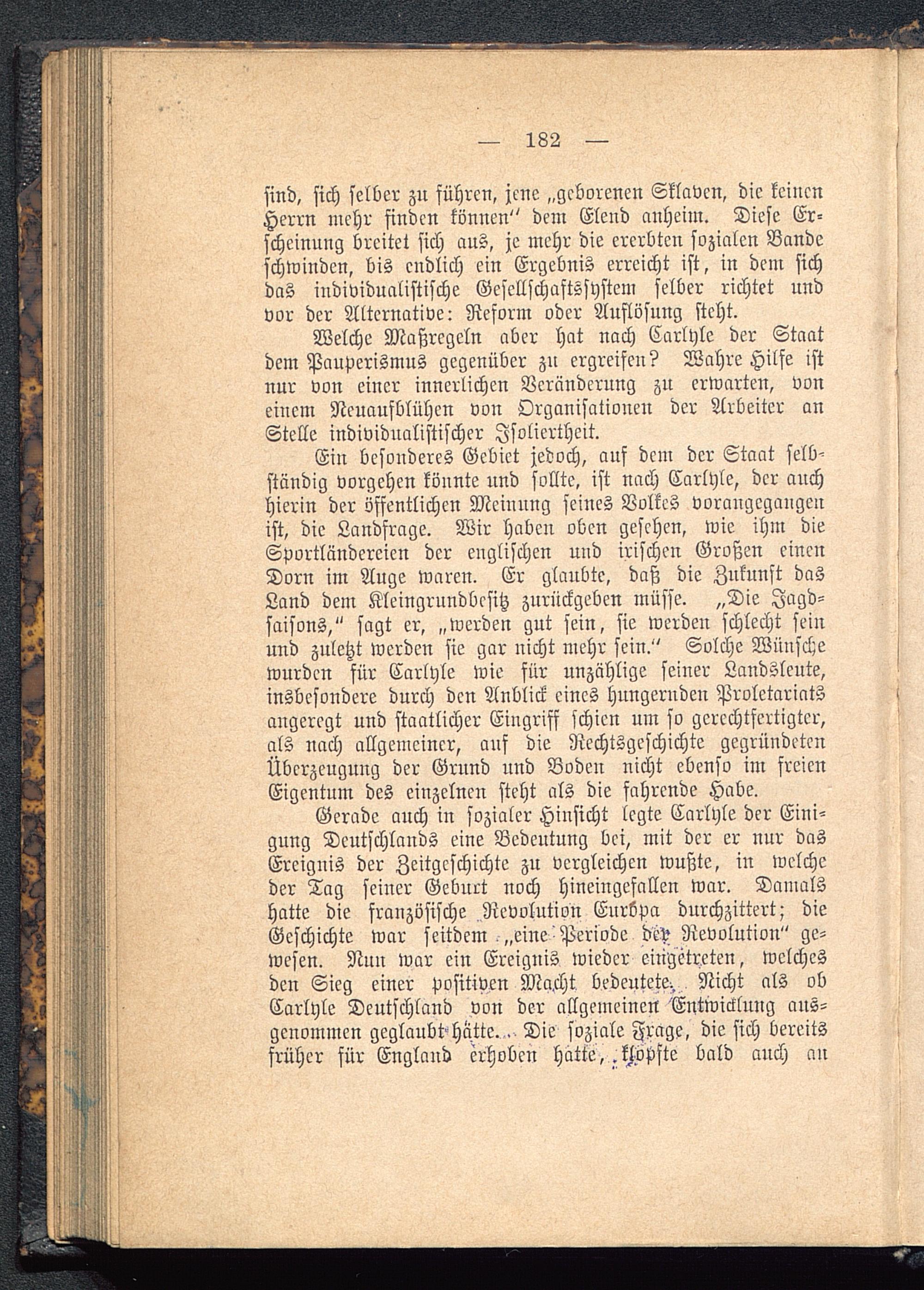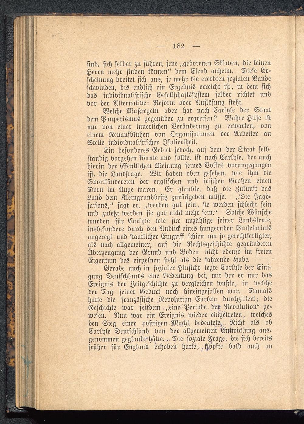 Ein besonderes Gebiet jedoch, ans dem der Staat selb'ständig vorgehen könnte und sollte, ist nach Carlyle, der auchhierin der öffentlichen Meinung seines Volkes vorangegangenist, die Landfrage. Wir haben oben gesehen, wie ihm dieSportländcreicn der englischen und irischen Großen einenDorn im Auge waren. Er glaubte, daß die Zukunft dasLand dem Klcingrnndbesitz zurückgeben müsse. „Die Jagd-saisons," sagt er, „werden gut sein, sie werden schlecht seinund zuletzt werden sie gar nicht mehr sein." Solche Wünschewurden für Carlyle wie für unzählige seiner Landslcnte,insbesondere durch den Anblick eines hungerudeu Proletariatsangeregt und staatlicher Eingriff schien um so gerechtfertigter,als nach allgemeiner, ans die Rechtsgeschichte gegründetenÜberzeugung der Grund und Boden nicht ebenso im freienEigentum des einzelnen steht als die fahrende Habe.