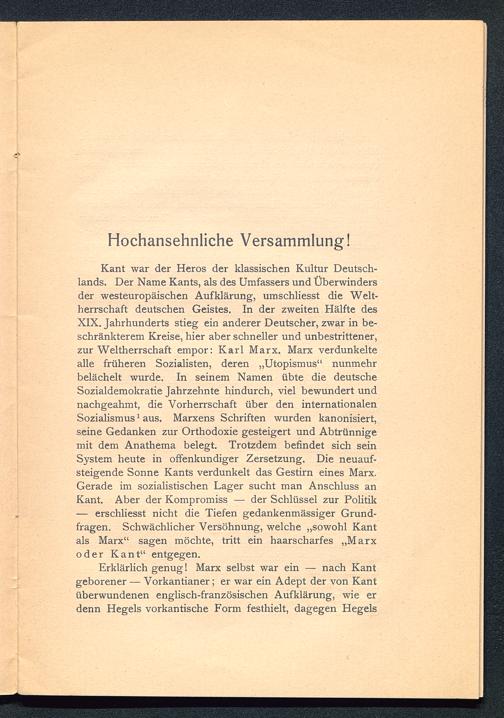Kant war der Heros der klassischen Kultur Deutsch-lands. Der Name Kants , als des Umfassers und Überwindersder westeuropäischen Aufklärung, umschliesst die Welt-herrschaft deutschen Geistes. In der zweiten Hälfte desXIX. Jahrhunderts stieg ein anderer Deutscher, zwar in be-schränkterem Kreise, hier aber schneller und unbestrittener,zur Weltherrschaft empor: Karl Marx. Marx verdunkeltealle früheren Sozialisten, deren „Utopismus“ nunmehrbelächelt wurde. In seinem Namen übte die deutsche Sozialdemokratie Jahrzehnte hindurch, viel bewundert undnachgeahmt, die Vorherrschaft über den internationalenSozialismus 1 aus. Marxens Schriften wurden kanonisiert,seine Gedanken zur Orthodoxie gesteigert und Abtrünnigemit dem Anathema belegt. Trotzdem befindet sich seinSystem heute in offenkundiger Zersetzung. Die neuauf-steigende Sonne Kants verdunkelt das Gestirn eines Marx.Gerade im sozialistischen Lager sucht man Anschluss anKant. Aber der Kompromiss — der Schlüssel zur Politik— erschliesst nicht die Tiefen gedankenmässiger Grund-fragen. Schwächlicher Versöhnung, welche „sowohl Kantals Marx“ sagen möchte, tritt ein haarscharfes „Marx oder Kant“ entgegen.