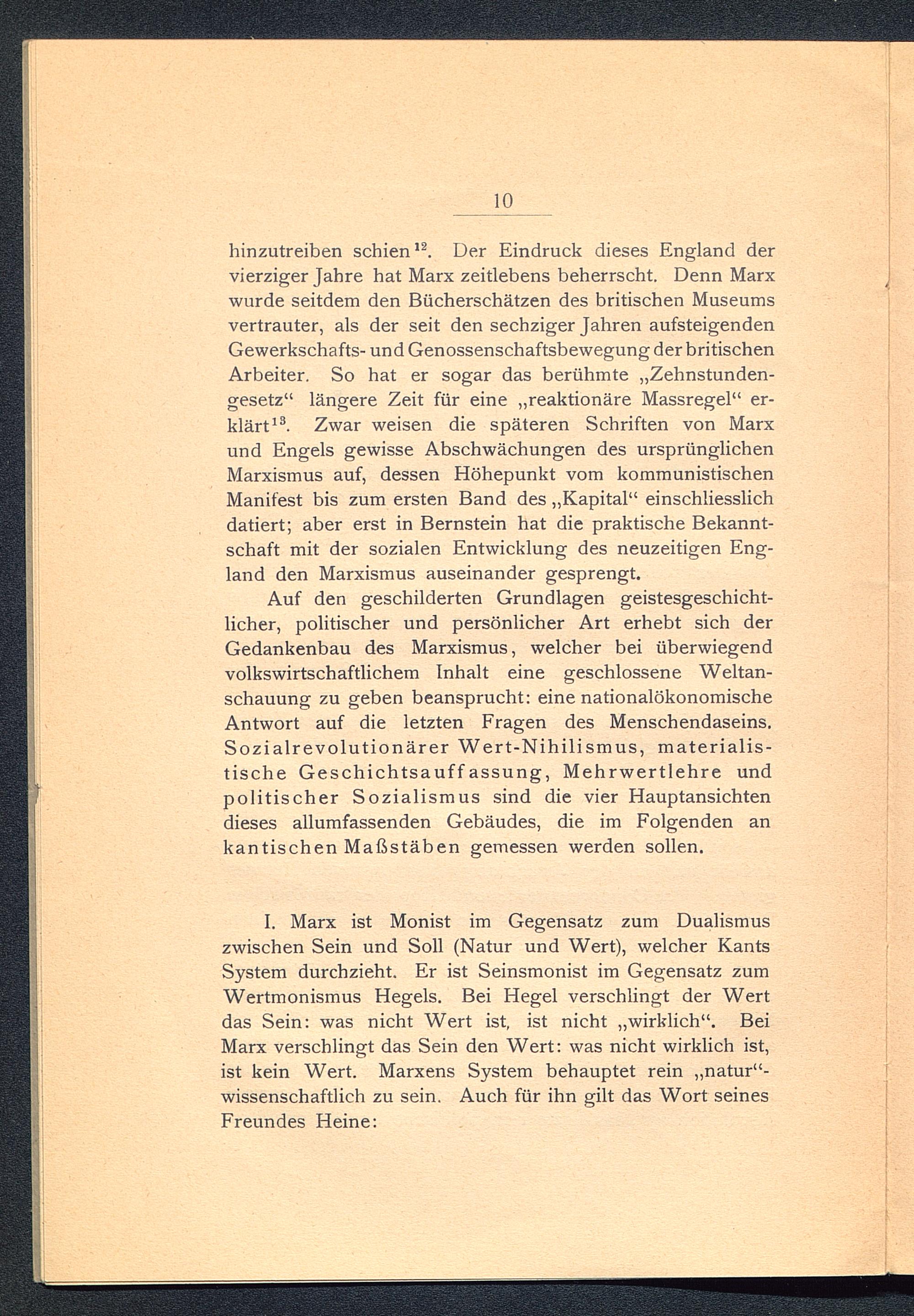 Auf den geschilderten Grundlagen geistesgeschicht-licher, politischer und persönlicher Art erhebt sich derGedankenbau des Marxismus, welcher bei überwiegendvolkswirtschaftlichem Inhalt eine geschlossene Weltan-schauung zu geben beansprucht: eine nationalökonomischeAntwort auf die letzten Fragen des Menschendaseins.Sozialrevolutionärer Wert-Nihilismus, materialis-tische Geschichtsauffassung, Mehrwertlehre undpolitischer Sozialismus sind die vier Hauptansichtendieses allumfassenden Gebäudes, die im Folgenden ankantischen Maßstäben gemessen werden sollen.