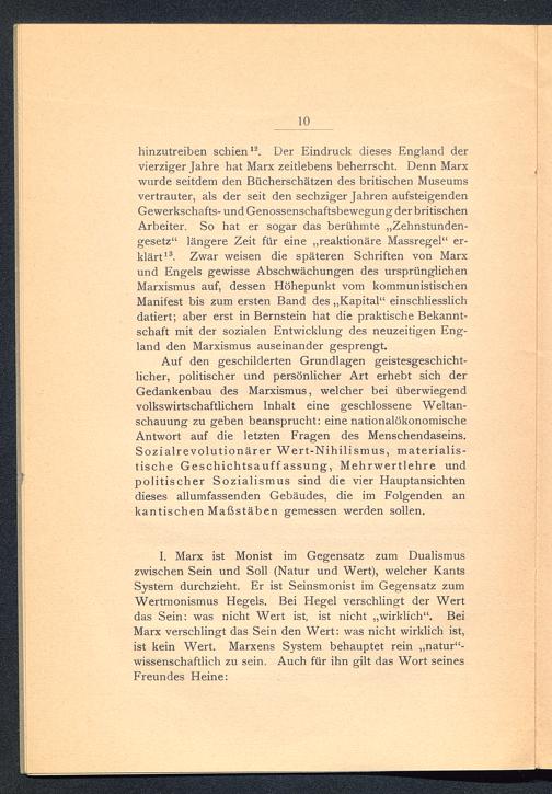 I. Marx ist Monist im Gegensatz zum Dualismuszwischen Sein und Soll (Natur und Wert), welcher KantsSystem durchzieht. Er ist Seinsmonist im Gegensatz zumWertmonismus Hegels. Bei Hegel verschlingt der Wertdas Sein: was nicht Wert ist, ist nicht „wirklich“. BeiMarx verschlingt das Sein den Wert: was nicht wirklich ist,ist kein Wert. Marxens System behauptet rein „natur-wissenschaftlich zu sein. Auch für ihn gilt das Wort seinesFreundes Heine: