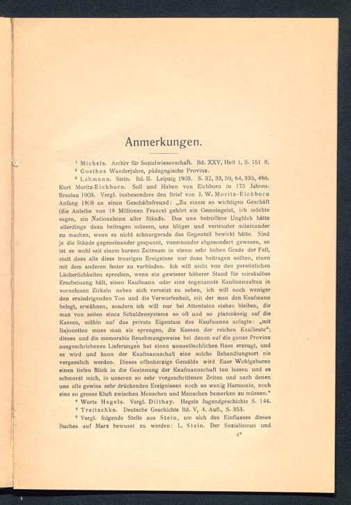 8 Lehmann. Stein. Bd. II. Leipzig 1903. S. 32, 33, 59, 64, 335, 486.Kurt Moritz-Eichborn. Soll und Haben von Eichborn in 175 Jahren.Breslau 1903. Vergl. insbesondere den Brief von J. W. Moritz-EichbornAnfang 1808 an einen Geschäftsfreund: „Zu einem so wichtigen Geschäft(die Anleihe von 18 Millionen Francs) gehört ein Gemeingeist, ich möchtesagen, ein Nationalsinn aller Stände. Das uns betroffene Unglück hätteallerdings dazu beitragen müssen, uns klüger und vertrauter miteinanderzu machen, wenn es nicht schnurgerade das Gegenteil bewirkt hätte. Sindje die Stände gegeneinander gespannt, voneinander abgesondert gewesen, soist es wohl seit einem kurzen Zeitraum in einem sehr hohen Grade der Fall,statt dass alle diese traurigen Ereignisse nur dazu beitragen sollten, einenmit dem anderen fester zu verbinden. Ich will nicht von den persönlichenLächerlichkeiten sprechen, wenn ein gewisser höherer Stand für mirakulöseErscheinung hält, einen Kaufmann oder eine sogenannte Kaufmannsfrau invornehmen Zirkeln neben sich versetzt zu sehen, ich will noch wenigerden erniedrigenden Ton und die Verworfenheit, mit der man den Kaufmannbelegt, erwähnen, sondern ich will nur bei Attentaten stehen bleiben, dieman von seiten eines Schuldensystems so oft und so planmässig auf dieKassen, mithin auf das private Eigentum des Kaufmanns anlegte: „mitBajonetten muss man sie sprengen, die Kassen der reichen Kaufleute“;dieses und die memorable Benehmungsweise bei denen auf die ganze Provinzausgeschriebenen Lieferungen hat einen unauslöschlichen Hass erzeugt, undes wird und kann der Kaufmannschaft eine solche Behandlungsart nievergesslich werden. Dieses offenherzige Gemälde wird Euer Wohlgeboreneinen tiefen Blick in die Gesinnung der Kaufmannschaft tun lassen und esschmerzt mich, in unseren so sehr vorgeschrittenen Zeiten und nach denenuns alle gewiss sehr drückenden Ereignissen noch so wenig Harmonie, nocheine so grosse Kluft zwischen Menschen und Menschen bemerken zu müssen.“