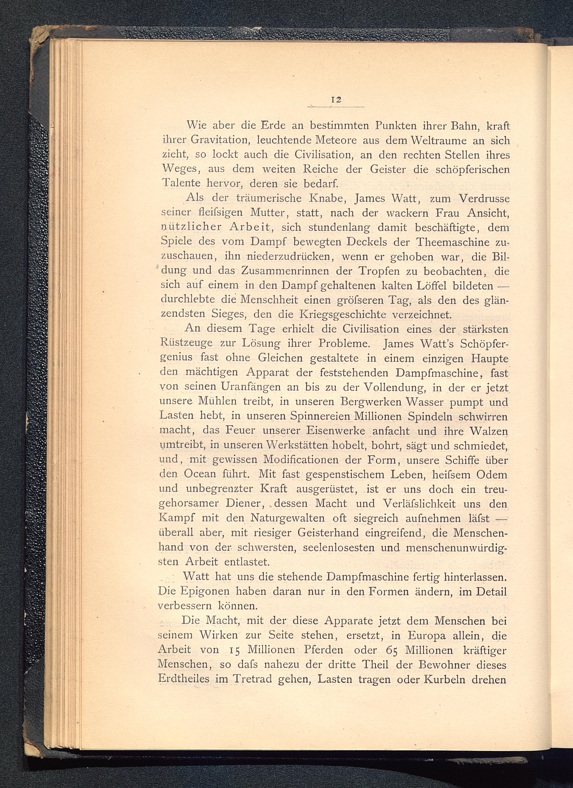 Als der träumerische Knabe, James Watt , zum Verdrusseseiner fleifsigen Mutter, statt, nach der wackern Frau Ansicht,nützlicher Arbeit, sich stundenlang damit beschäftigte, demSpiele des vom Dampf bewegten Deckels der Theemaschine zu-zuschauen, ihn niederzudrücken, wenn er gehoben war, die Bil-dung und das Zusammenrinnen der Tropfen zu beobachten, diesich auf einem in den Dampf gehaltenen kalten Löffel bildeten —durchlebte die Menschheit einen gröfseren Tag, als den des glän-zendsten Sieges, den die Kriegsgeschichte verzeichnet.