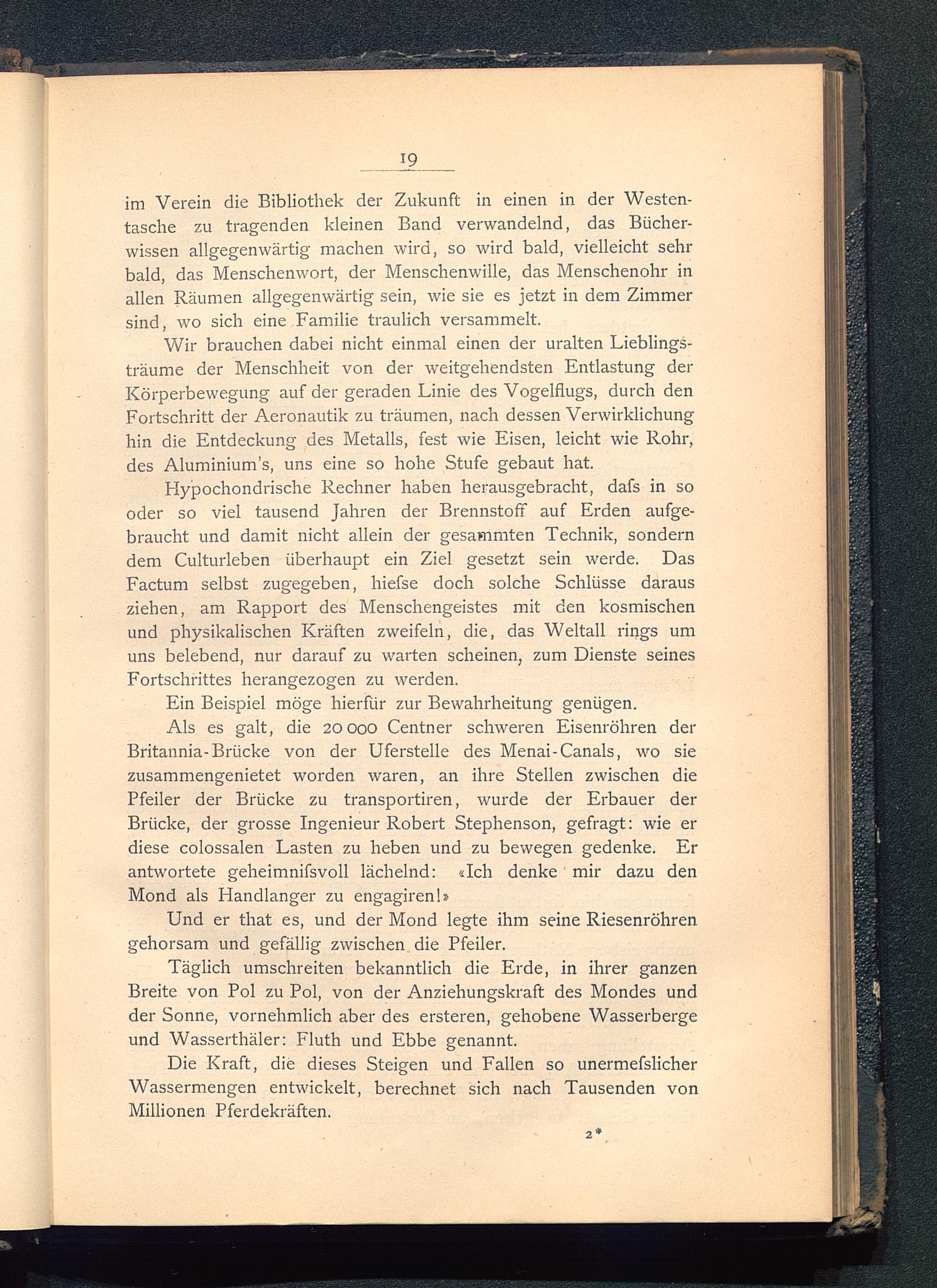 Wir brauchen dabei nicht einmal einen der uralten Lieblings-träume der Menschheit von der weitgehendsten Entlastung derKörperbewegung auf der geraden Linie des Vogelflugs, durch denFortschritt der Aeronautik zu träumen, nach dessen Verwirklichunghin die Entdeckung des Metalls, fest wie Eisen, leicht wie Rohr,des Aluminium’s , uns eine so hohe Stufe gebaut hat.
