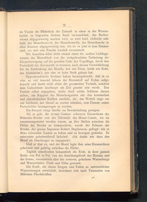 im Verein die Bibliothek der Zukunft in einen in der Westen-tasche zu tragenden kleinen Band verwandelnd, das Bücher-wissen allgegenwärtig machen wird, so wird bald, vielleicht sehrbald, das Menschenwort, der Menschenwille, das Menschenohr inallen Räumen allgegenwärtig sein, wie sie es jetzt in dem Zimmersind, wo sich eine Familie traulich versammelt.