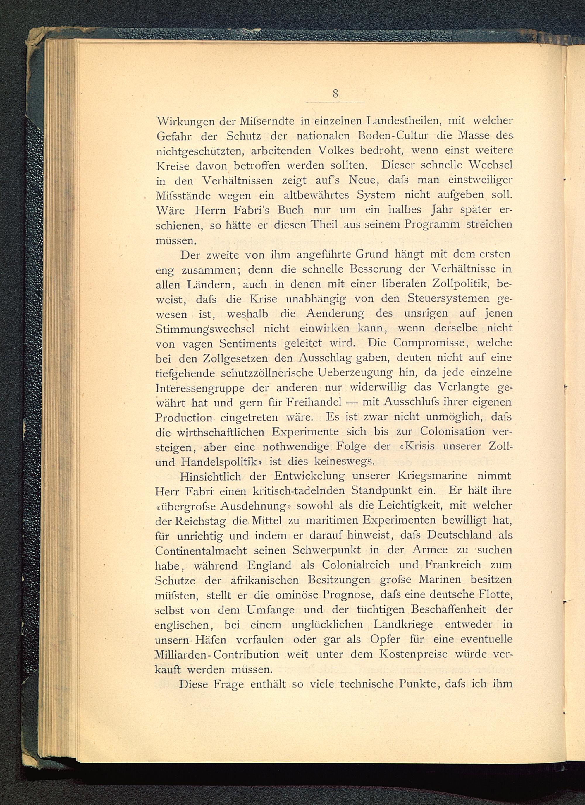 Hinsichtlich der Entwickelung unserer Kriegsmarine nimmtHerr Fabri einen kritisch-tadelnden Standpunkt ein. Er hält ihre«übergrofse Ausdehnung» sowohl als die Leichtigkeit, mit welcherder Reichstag die Mittel zu maritimen Experimenten bewilligt hat,für unrichtig und indem er darauf hinweist, dafs Deutschland alsContinentalmacht seinen Schwerpunkt in der Armee zu suchenhabe, während England als Colonialreich und Frankreich zumSchutze der afrikanischen Besitzungen grofse Marinen besitzenmüfsten, stellt er die ominöse Prognose, dafs eine deutsche Flotte,selbst von dem Umfange und der tüchtigen Beschaffenheit derenglischen, bei einem unglücklichen Landkriege entweder inunsern Häfen verfaulen oder gar als Opfer ffir eine eventuelleMilliarden-Contribution weit unter dem Kostenpreise würde ver-kauft werden müssen.