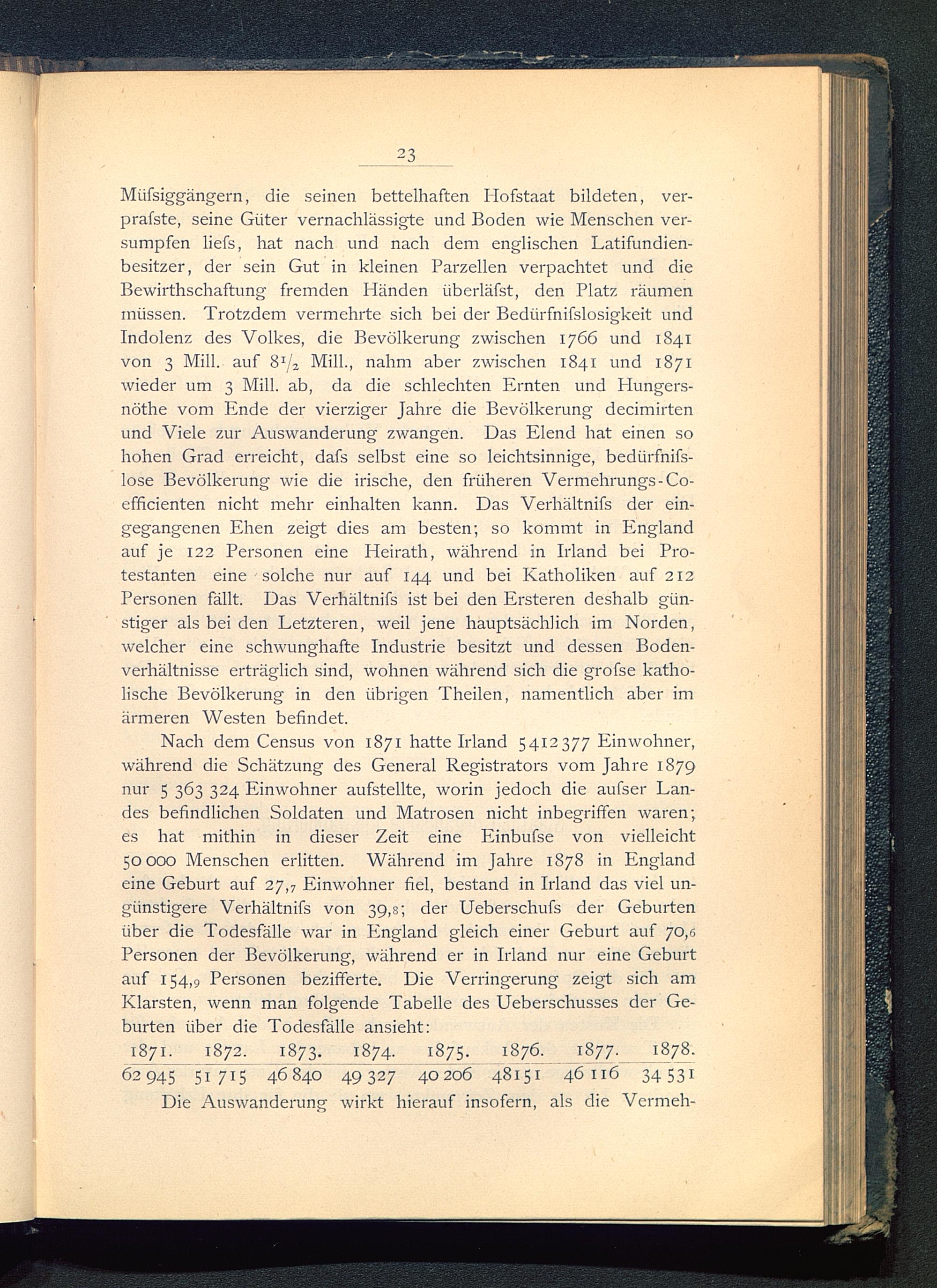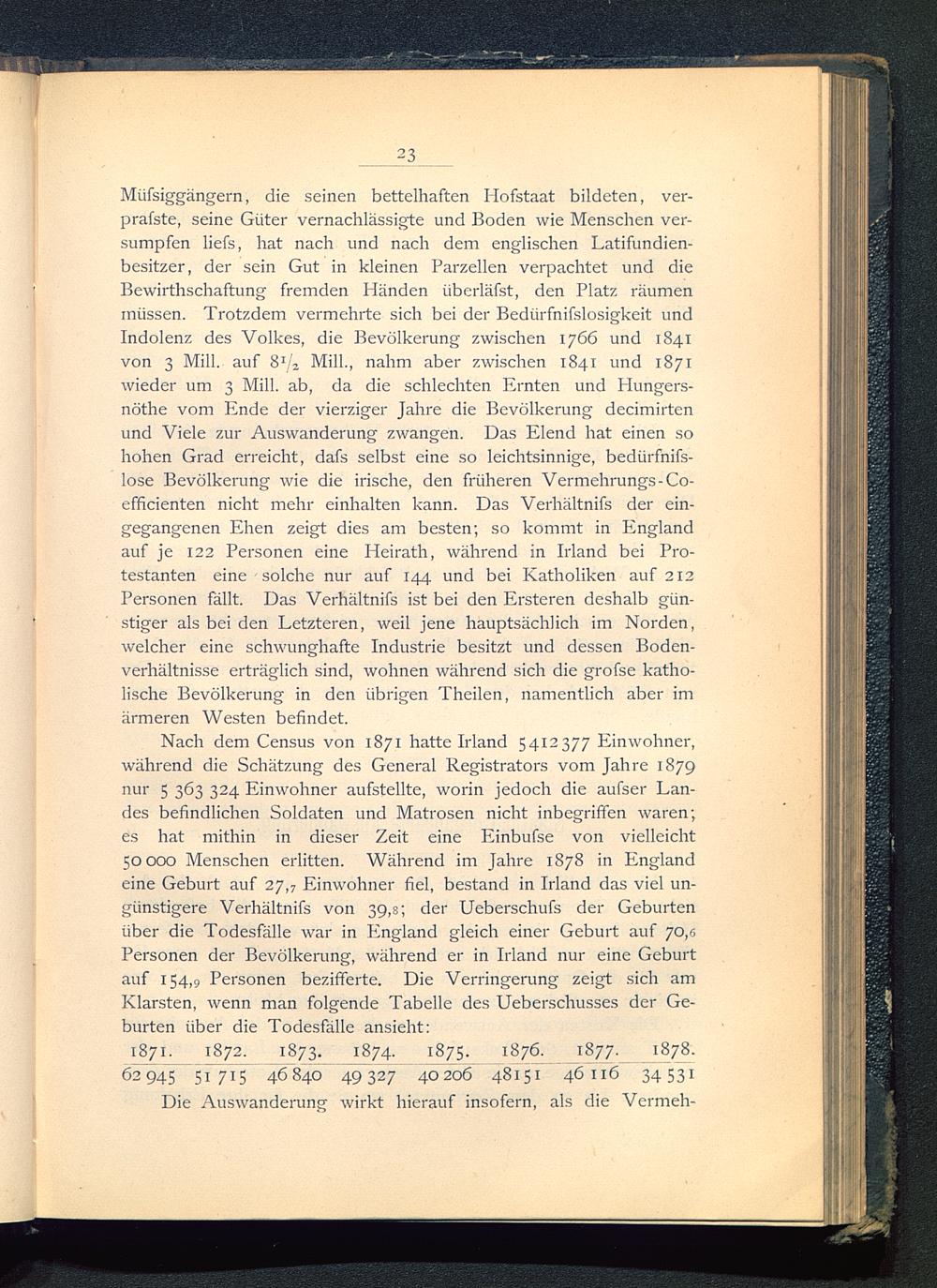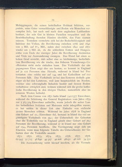 Miifsiggängern, die seinen bettelhaften Hofstaat bildeten, ver-prafste, seine Güter vernachlässigte und Boden wie Menschen ver-sumpfen liefs, hat nach und nach dem englischen Latifundien-besitzer, der sein Gut in kleinen Parzellen verpachtet und dieBewirthschaftung fremden Händen iiberläfst, den Platz räumenmüssen. Trotzdem vermehrte sich bei der Bedürfnifslosigkeit undIndolenz des Volkes, die Bevölkerung zwischen 1766 und 1841von 3 Mill. auf 8 1 / z Milk, nahm aber zwischen 1841 und 1871wieder um 3 Milk ab, da die schlechten Ernten und Hungers-nöthe vom Ende der vierziger Jahre die Bevölkerung decimirtenund Viele zur Auswanderung zwangen. Das Elend hat einen sohohen Grad erreicht, dafs selbst eine so leichtsinnige, bedtirfnifs-lose Bevölkerung wie die irische, den früheren Vermehrungs-Co-efficienten nicht mehr einhalten kann. Das Verhältnis der ein-gegangenen Ehen zeigt dies am besten; so kommt in England auf je 122 Personen eine Heirath, während in Irland bei Pro-testanten eine solche nur auf 144 und bei Katholiken auf 212Personen fällt. Das Verhältnifs ist bei den Ersteren deshalb gün-stiger als bei den Letzteren, weil jene hauptsächlich im Norden,welcher eine schwunghafte Industrie besitzt und dessen Boden-verhältnisse erträglich sind, wohnen während sich die grofse katho-lische Bevölkerung in den übrigen Theilen, namentlich aber imärmeren Westen befindet.