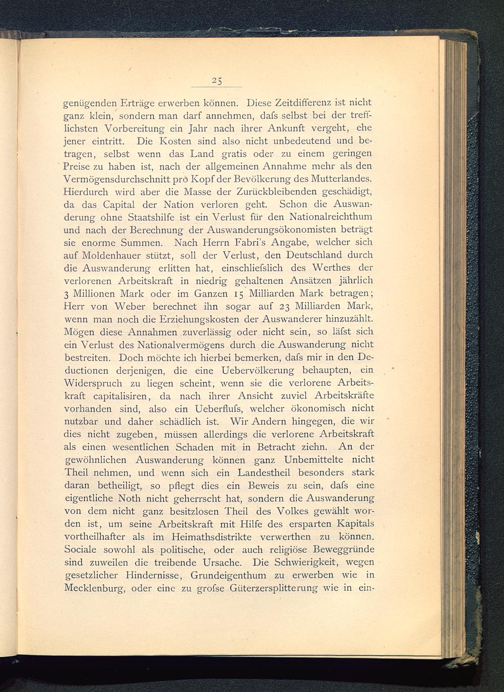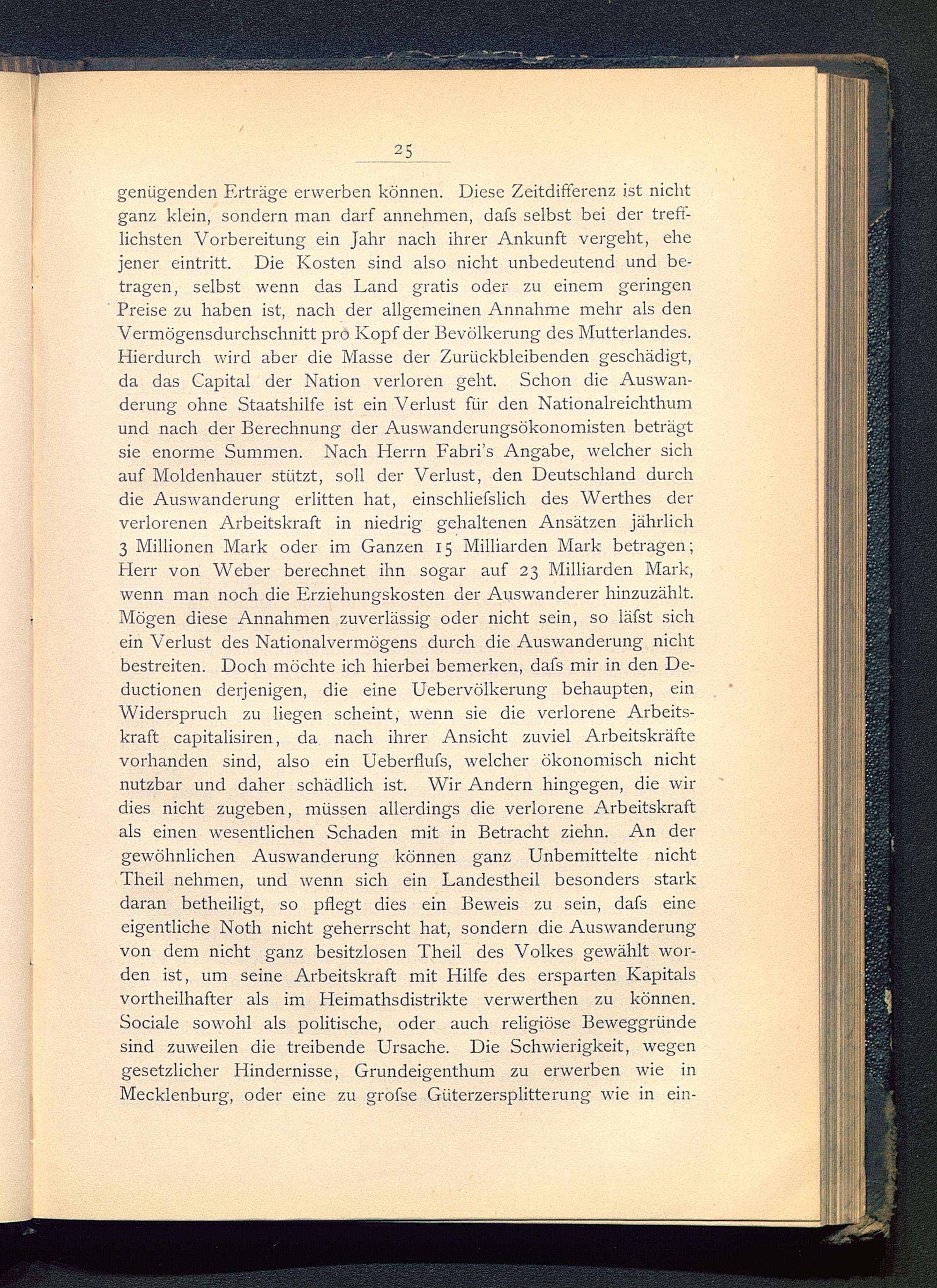 genügenden Erträge erwerben können. Diese Zeitdifferenz ist nichtganz klein, sondern man darf annehmen, dafs selbst bei der treff-lichsten Vorbereitung ein Jahr nach ihrer Ankunft vergeht, ehejener eintritt. Die Kosten sind also nicht unbedeutend und be-tragen, selbst wenn das Land gratis oder zu einem geringenPreise zu haben ist, nach der allgemeinen Annahme mehr als denVermögensdurchschnitt pro Kopf der Bevölkerung des Mutterlandes.Hierdurch wird aber die Masse der Zurückbleibenden geschädigt,da das Capital der Nation verloren geht. Schon die Auswan-derung ohne Staatshilfe ist ein Verlust für den Nationalreichthumund nach der Berechnung der Auswanderungsökonomisten beträgtsie enorme Summen. Nach Herrn Fabri’s Angabe, welcher sichauf Moldenhauer stützt, soll der Verlust, den Deutschland durchdie Auswanderung erlitten hat, einschliefslich des Werthes derverlorenen Arbeitskraft in niedrig gehaltenen Ansätzen jährlich3 Millionen Mark oder im Ganzen 15 Milliarden Mark betragen;Herr von Weber berechnet ihn sogar auf 23 Milliarden Mark,wenn man noch die Erziehungskosten der Auswanderer hinzuzählt.Mögen diese Annahmen zuverlässig oder nicht sein, so läfst sichein Verlust des Nationalvermögens durch die Auswanderung nichtbestreiten. Doch möchte ich hierbei bemerken, dafs mir in den De-ductionen derjenigen, die eine Uebervölkerung behaupten, einWiderspruch zu liegen scheint, wenn sie die verlorene Arbeits-kraft capitalisiren, da nach ihrer Ansicht zuviel Arbeitskräftevorhanden sind, also ein Ueberflufs, welcher ökonomisch nichtnutzbar und daher schädlich ist. Wir Andern hingegen, die wirdies nicht zugeben, müssen allerdings die verlorene Arbeitskraftals einen wesentlichen Schaden mit in Betracht ziehn. An dergewöhnlichen Auswanderung können ganz Unbemittelte nichtTheil nehmen, und wenn sich ein Landestheil besonders starkdaran betheiligt, so pflegt dies ein Beweis zu sein, dafs eineeigentliche Notli nicht geherrscht hat, sondern die Auswanderungvon dem nicht ganz besitzlosen Theil des Volkes gewählt wor-den ist, um seine Arbeitskraft mit Hilfe des ersparten Kapitalsvortheilhafter als im Heimathsdistrikte verwerthen zu können.Sociale sowohl als politische, oder auch religiöse Beweggründesind zuweilen die treibende Ursache. Die Schwierigkeit, wegengesetzlicher Hindernisse, Grundeigenthum zu erwerben wie inMecklenburg , oder eine zu grofse Güterzersplitterung wie in ein-